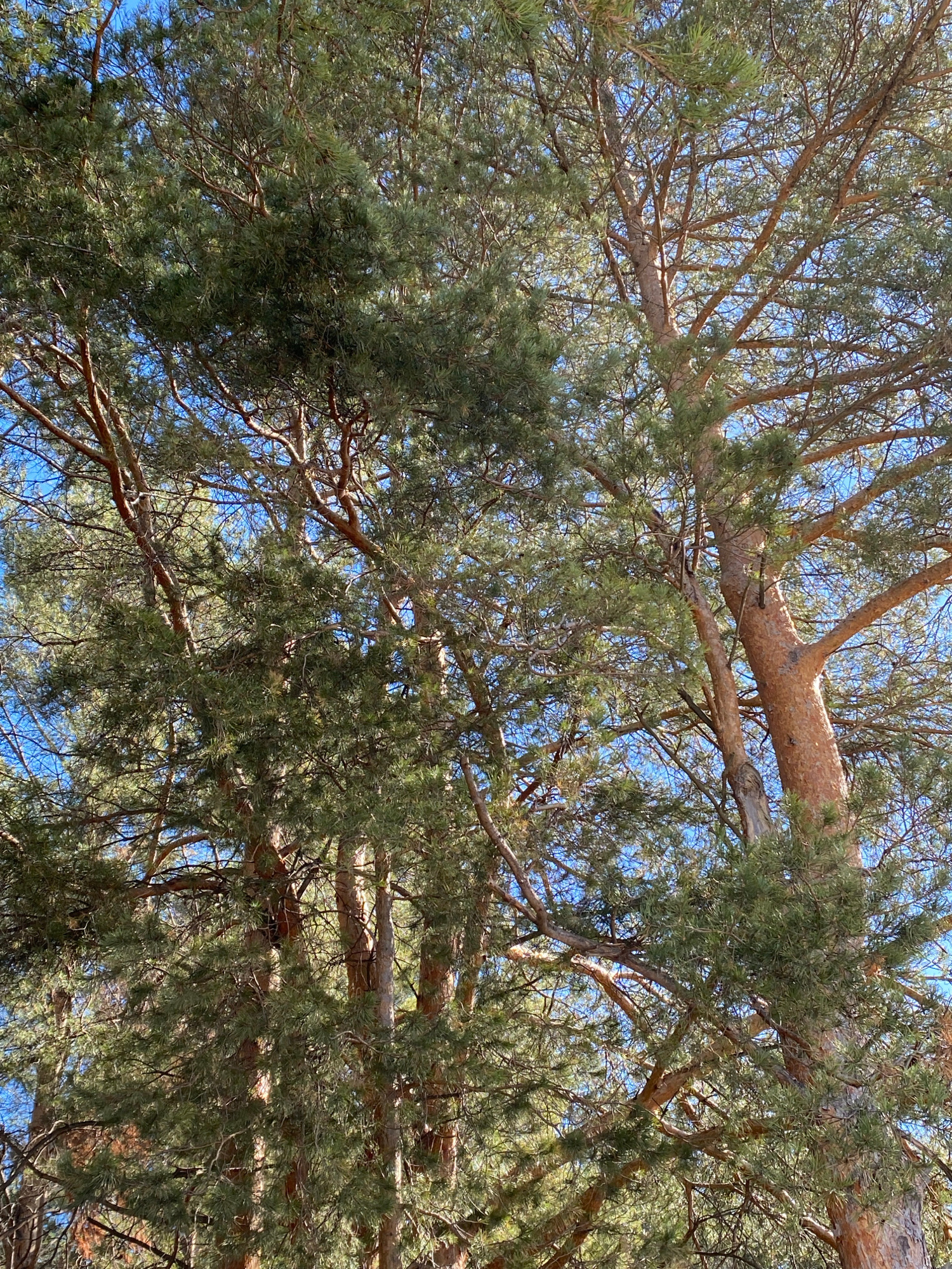 The image shows a view looking up into the canopy of a pine tree against a blue sky. The branches are a light brown color and are covered with green pine needles. The needles appear dense in some area…read more