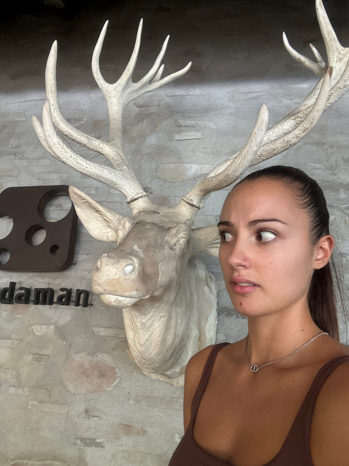 The image captures a young adult female in the foreground, positioned to the right of a large, light-colored deer head sculpture mounted on a textured, light gray stone wall. The setting is identified…read more