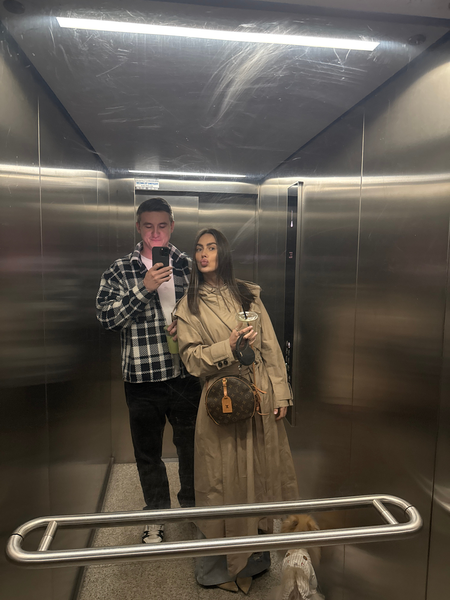 Two individuals are photographed in an elevator, presumably in Warsaw, Poland, as indicated by a sign in Polish visible in the mirror. One individual is male, wearing a black and white checkered shirt…read more