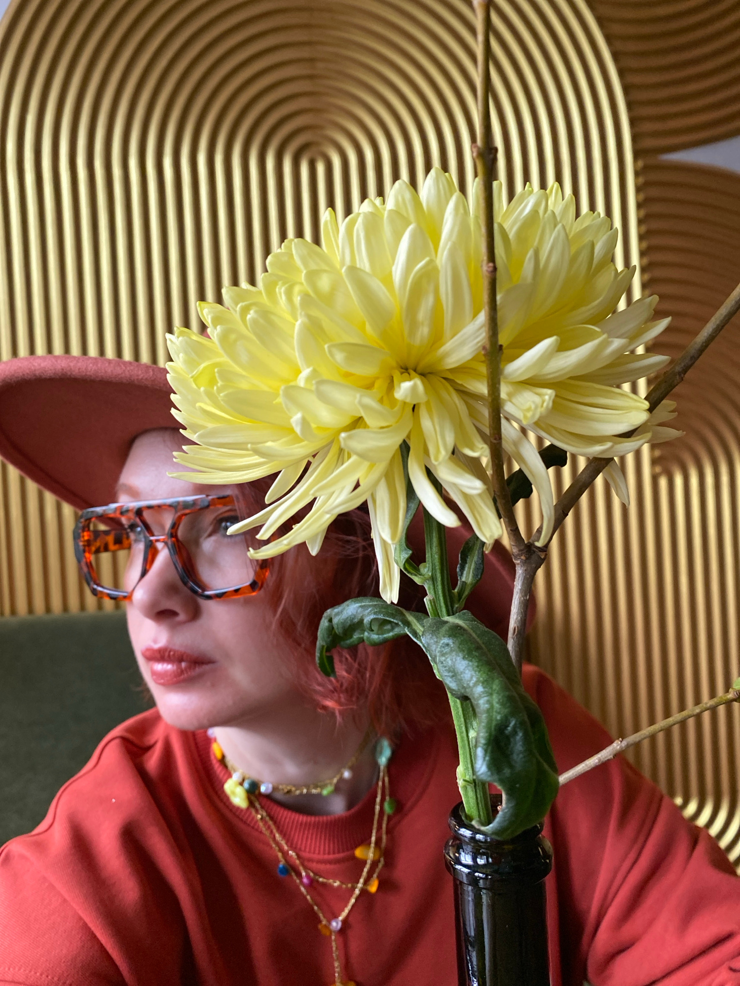 A rotated eye-level shot reveals a person wearing orange-framed glasses, a brown hat, and an orange sweater. A necklace with colorful beads adorns their neck. They are positioned to the right of a bla…read more