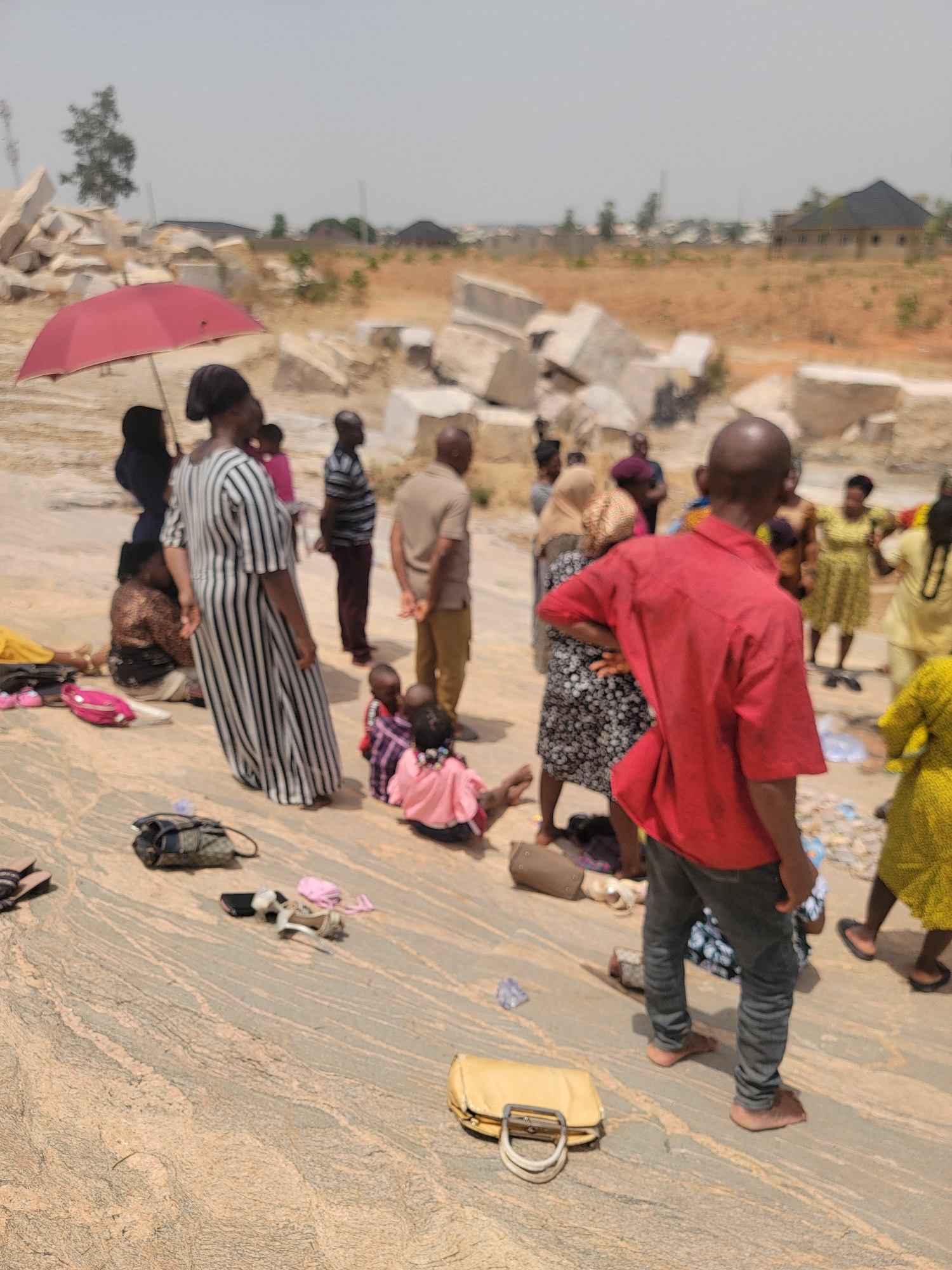 The image depicts a group of people in Narayi, Nigeria, some lying face down on what appears to be a stone surface, possibly praying or in a posture of submission. Individuals are dressed in diverse c…read more