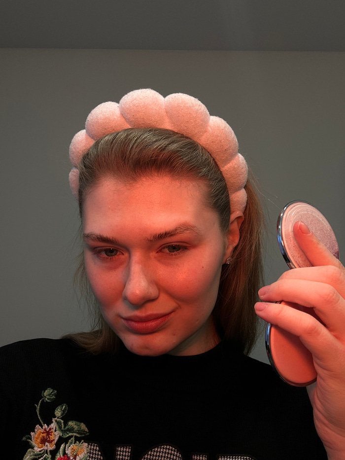 A woman with a pink flower headband holds two round compacts. One of her fingers presses into the open compact's powder. She wears a black shirt decorated with a floral embroidery design and a houndst…read more