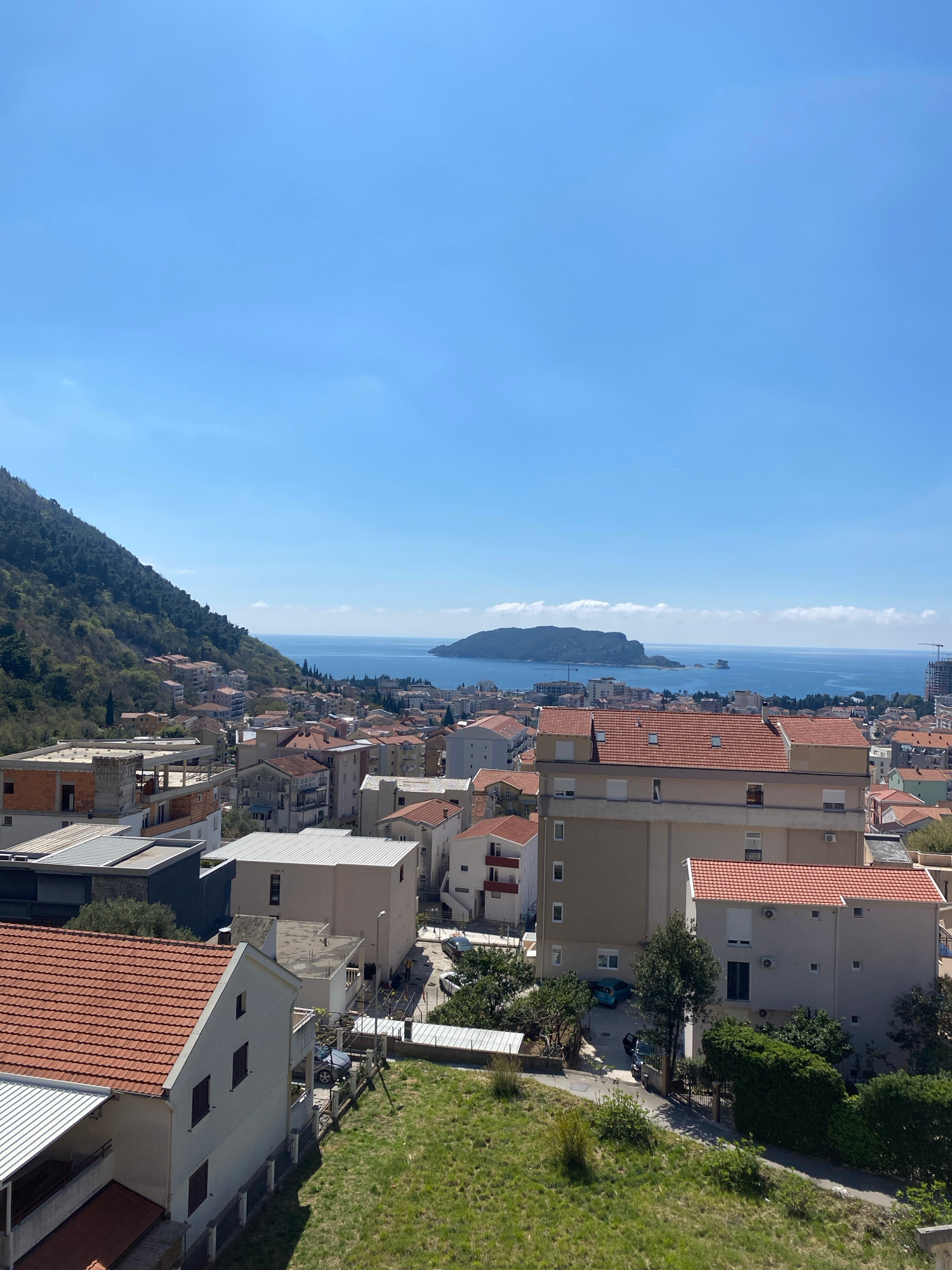 A high-angle, outdoor photograph reveals a cityscape and coastal view in Budva, Montenegro. The scene, lit by daylight, has a clear, blue sky. Buildings, predominantly with red-tiled roofs, occupy the…read more