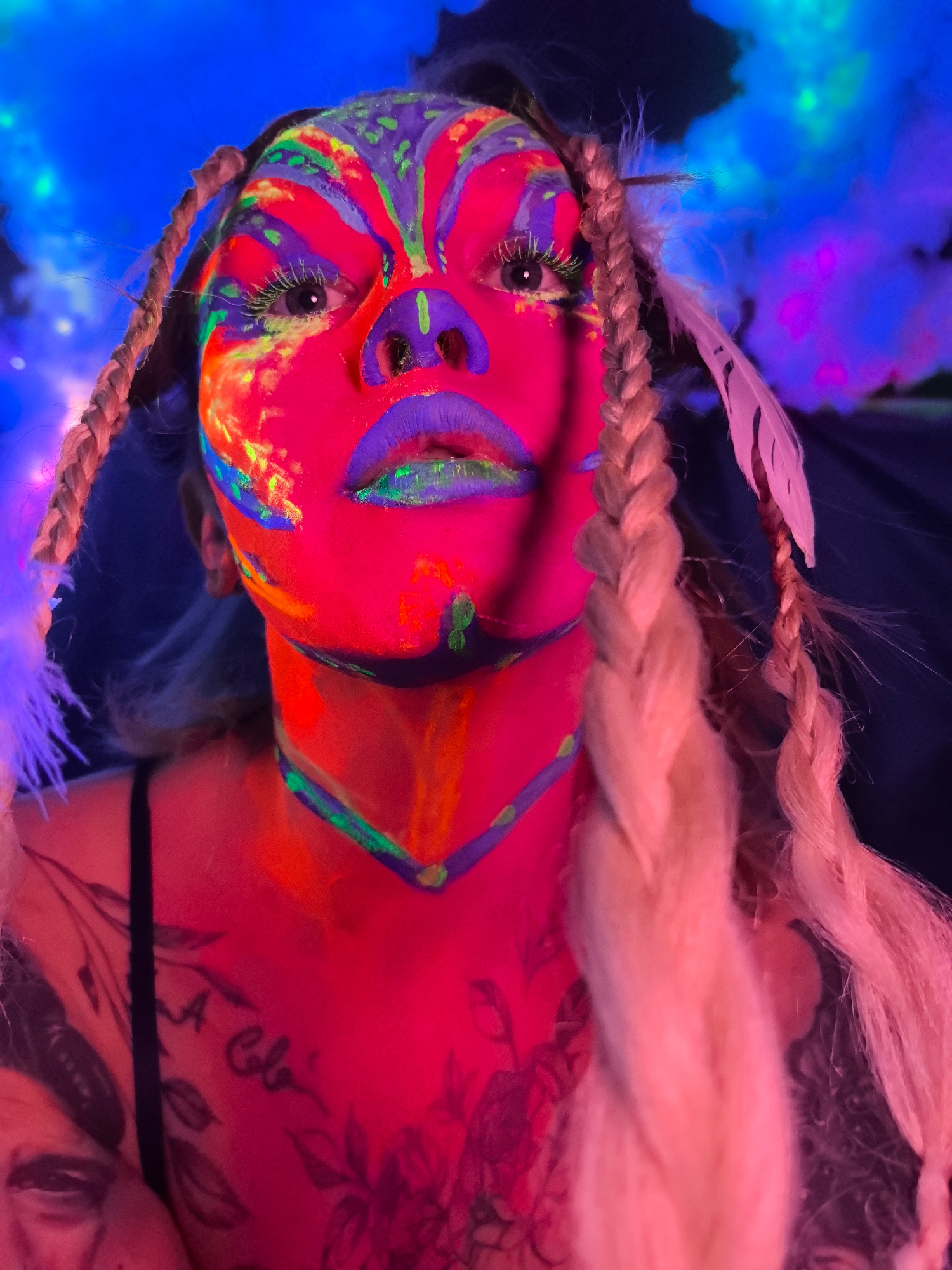 The image presents a striking, close-up portrait of a person with elaborate, neon-glowing face and body paint, captured under blacklight in what appears to be an indoor setting in Noviy, Russia. The s…read more