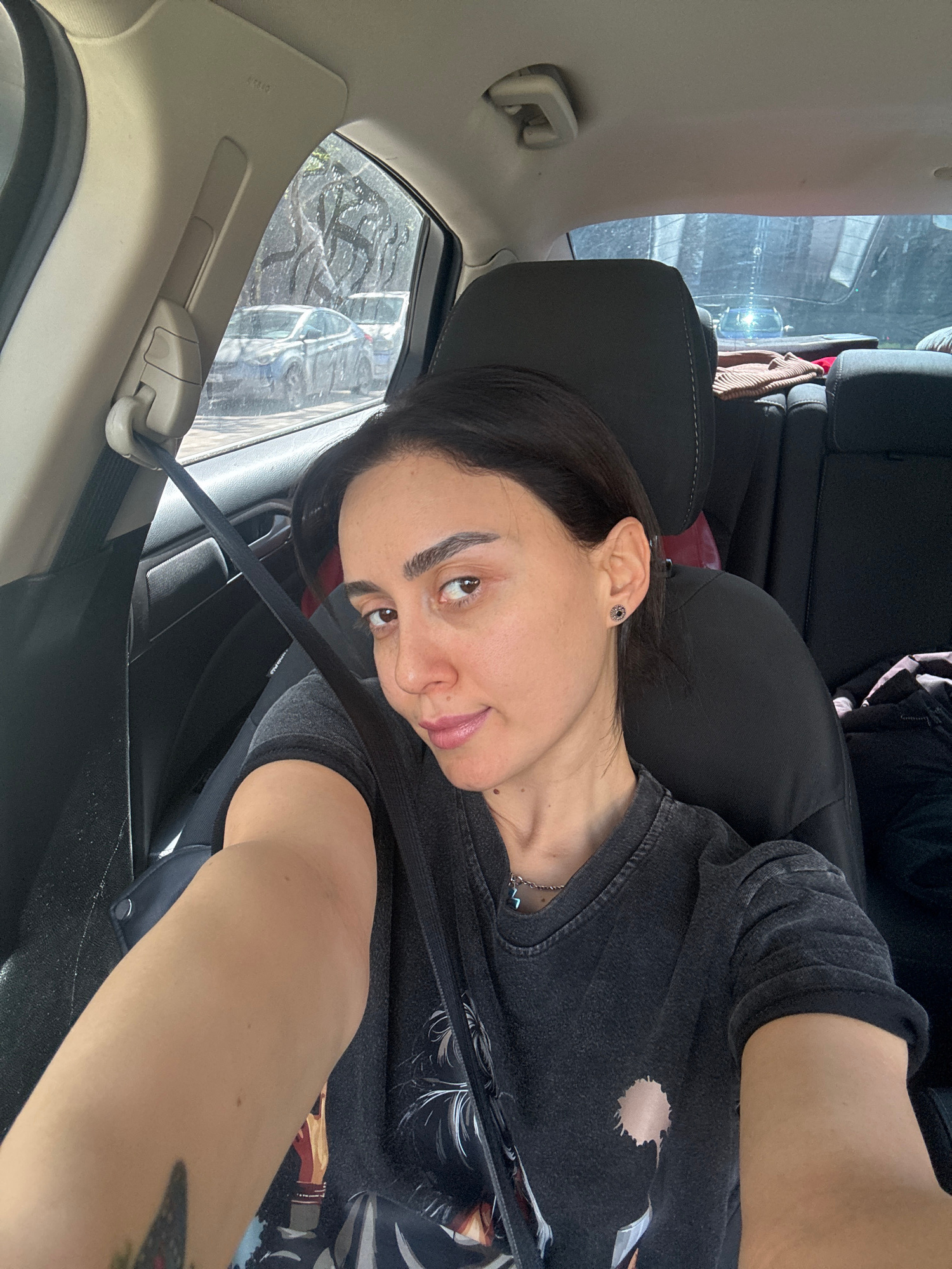 A woman is sitting in the back seat of a car, wearing a seatbelt and facing the camera. She has dark hair and is wearing a dark-colored shirt or jacket. The car's window is visible in the background,…read more