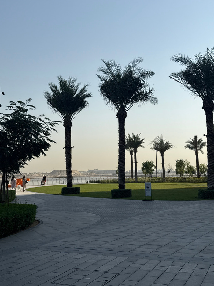 Palm trees line a path with lush green grass, small shrubs, and a gray brick path. The trees get smaller as the perspective shifts. A few people are walking or sitting near a low wall in the distance.…read more