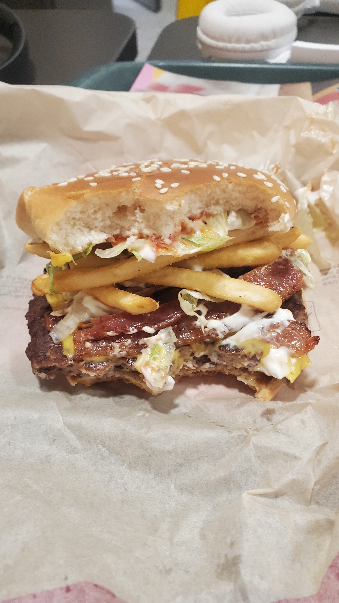 The image depicts a partially eaten burger with visible ingredients such as a sesame seed bun, fries, bacon, lettuce, mayonnaise, and a beef patty. The burger sits on crumpled paper, likely from a fas…read more