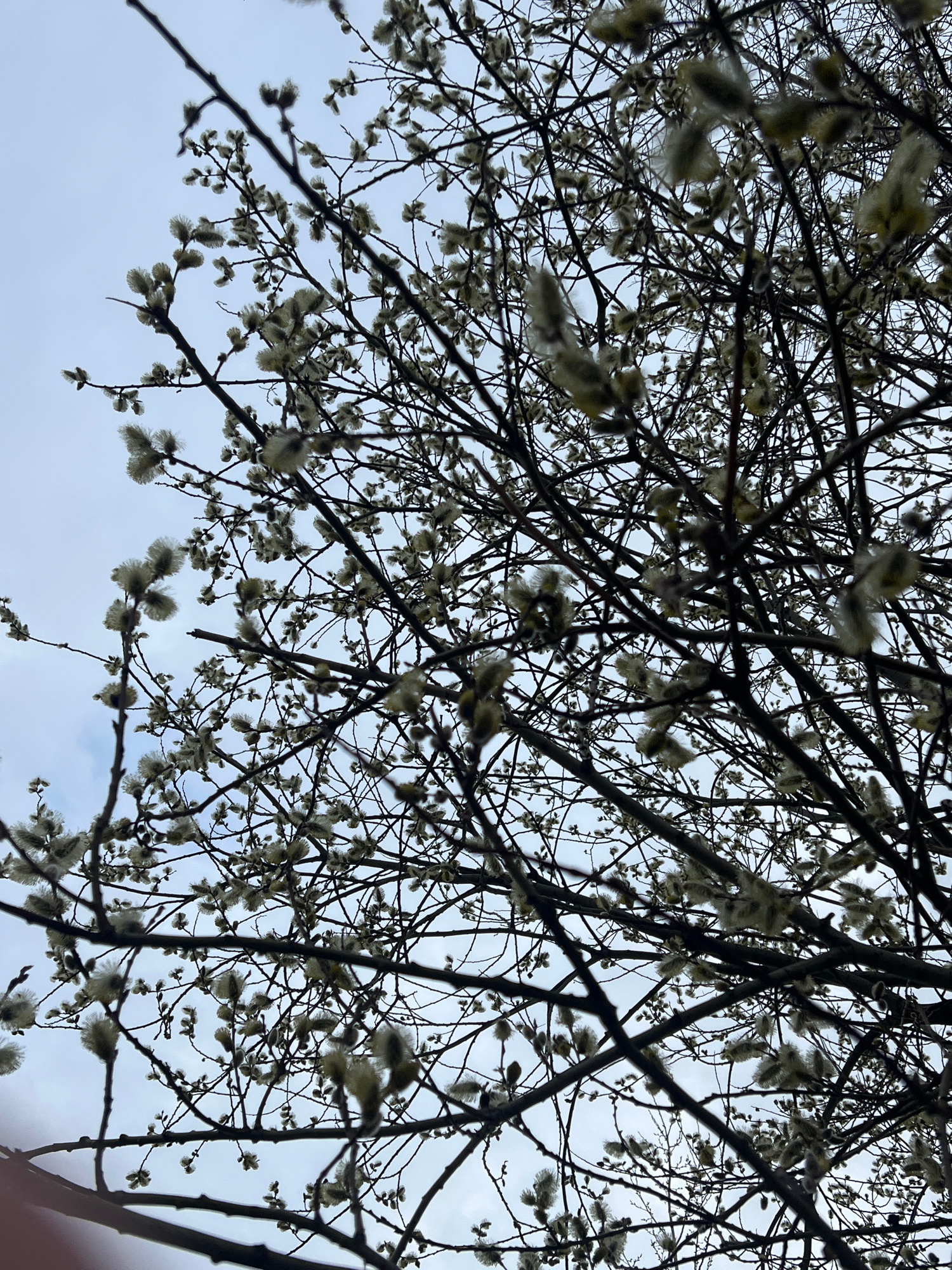 The image captures a dense network of pussy willow branches, heavily laden with soft, fluffy catkins, silhouetted against a bright, overcast sky. The perspective is looking upwards through the canopy…read more