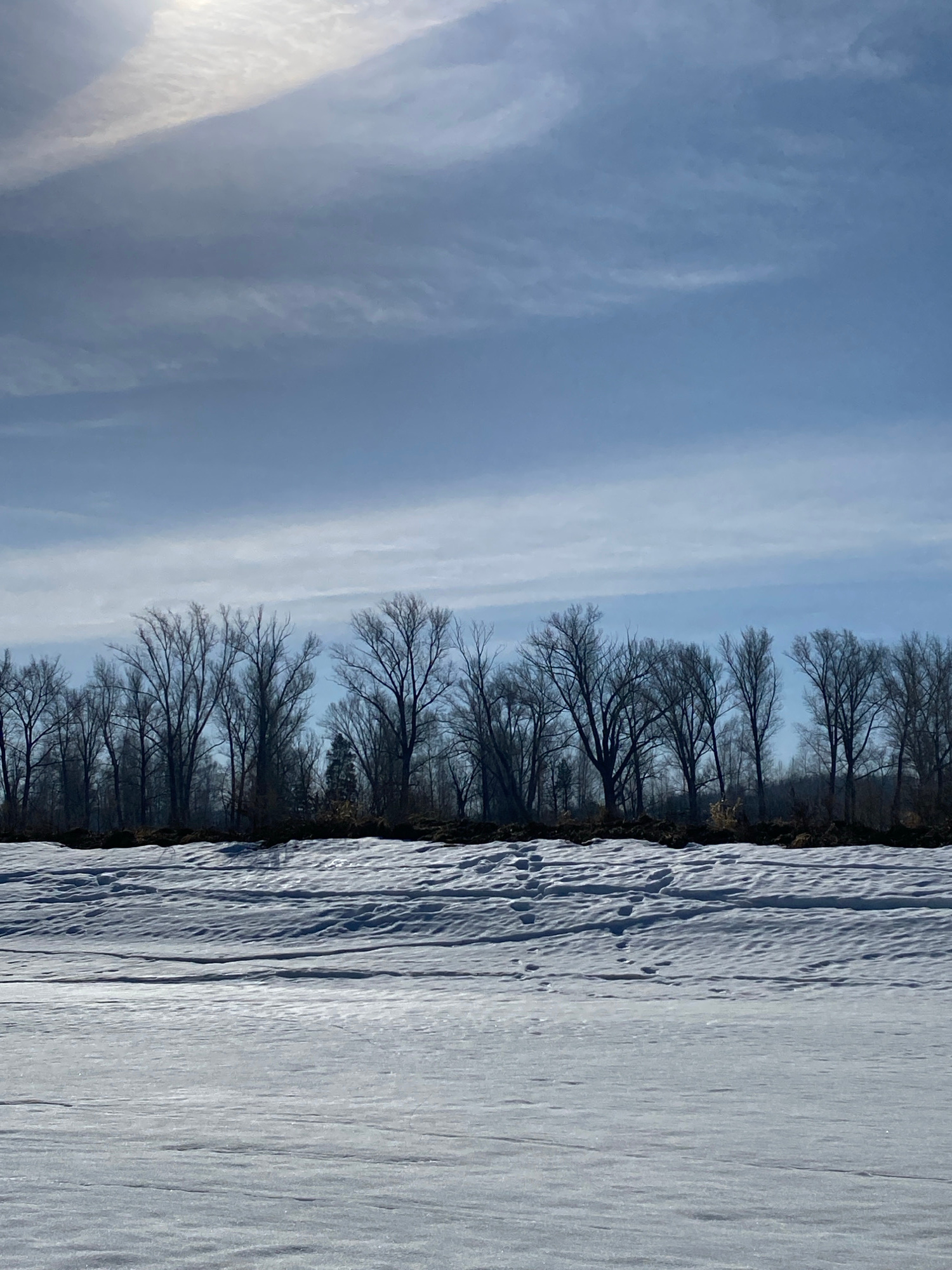 The image shows a winter landscape in Ol'khovskoye, Russia. The scene includes a snow-covered field or frozen lake extending to the right, with footprints visible in the snow. A line of bare trees for…read more