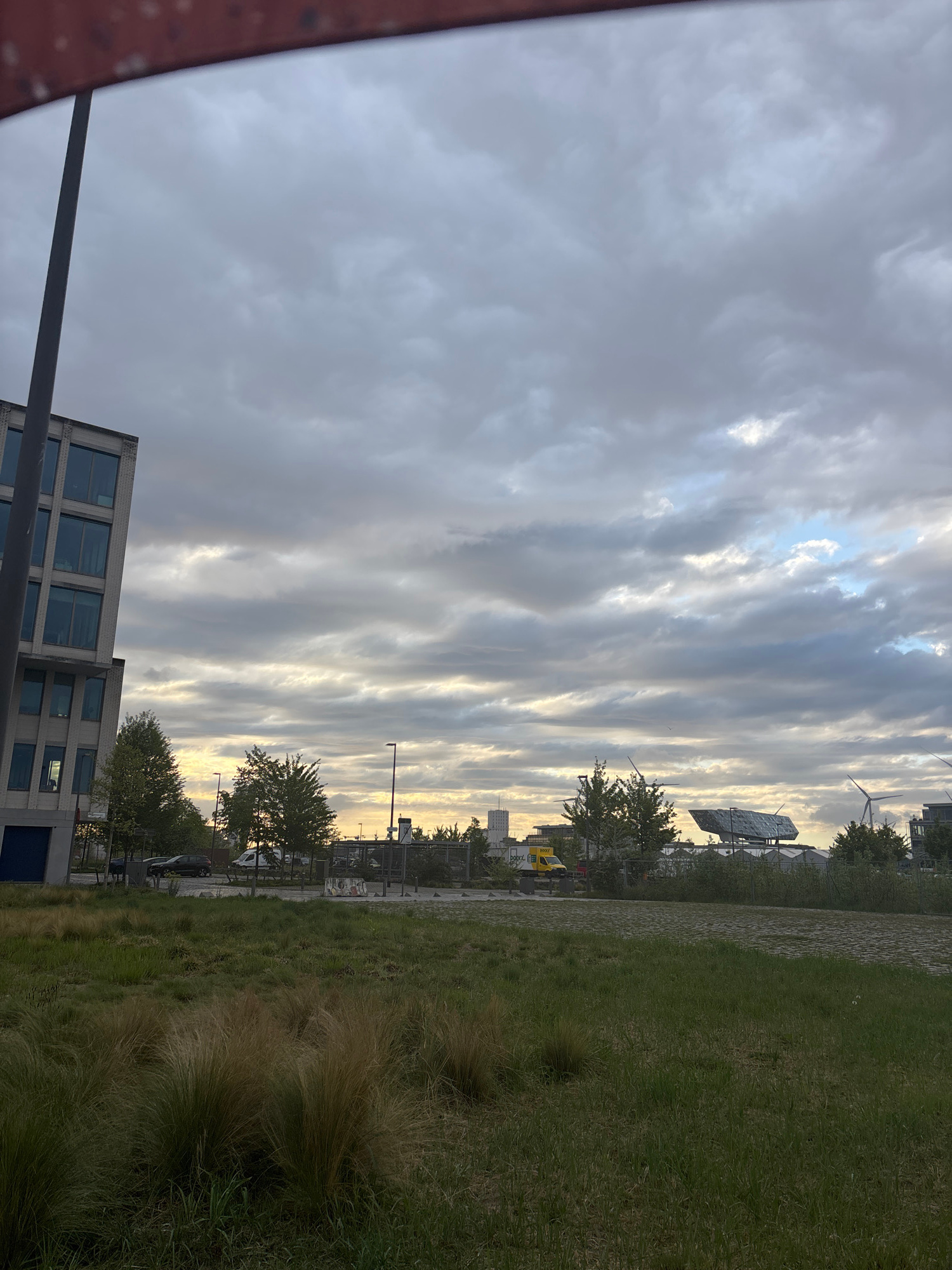 The image shows an outdoor scene in Antwerp, Belgium. A multi-story building with modern architecture is visible in the lower left corner. The sky is filled with layered, striated clouds. A grassy are…read more