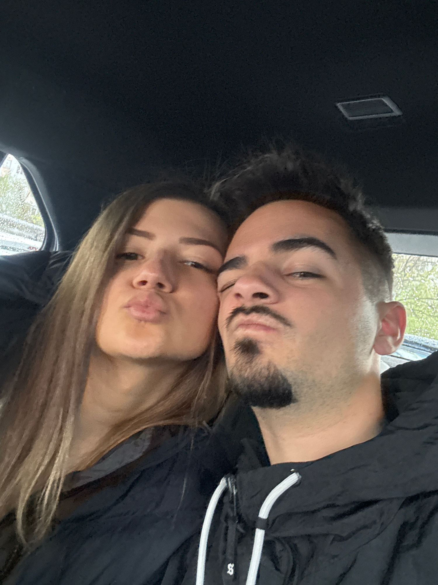 A photo, taken from a low angle, depicts two people. A woman with long brown hair is in the foreground, making a kissing face towards the camera. Behind her, a man with short dark hair and a beard res…read more