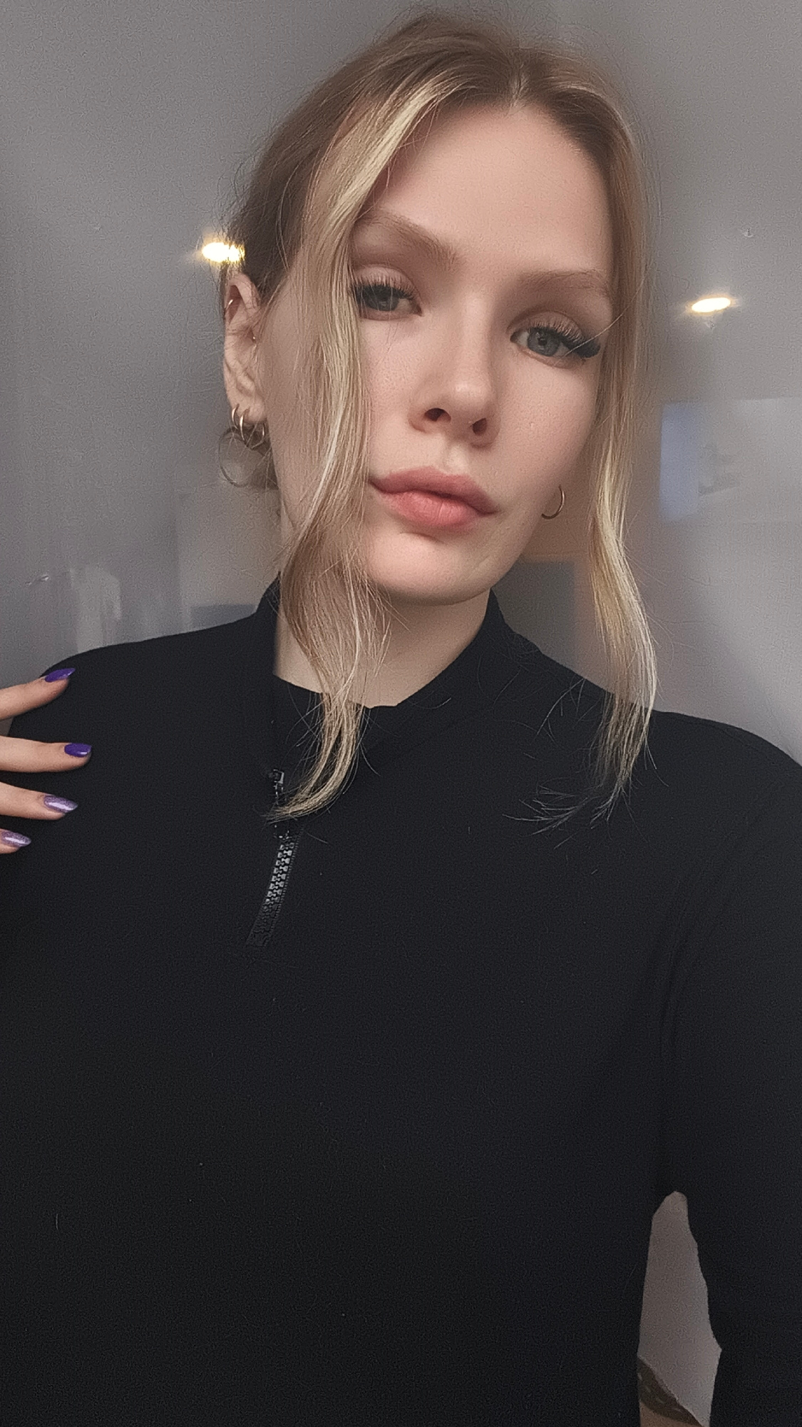 A woman with blonde hair and fair skin is posing indoors. She wears a black turtleneck shirt with a visible zipper. Her nails are painted purple. She is wearing multiple hoop earrings on her left ear.…read more