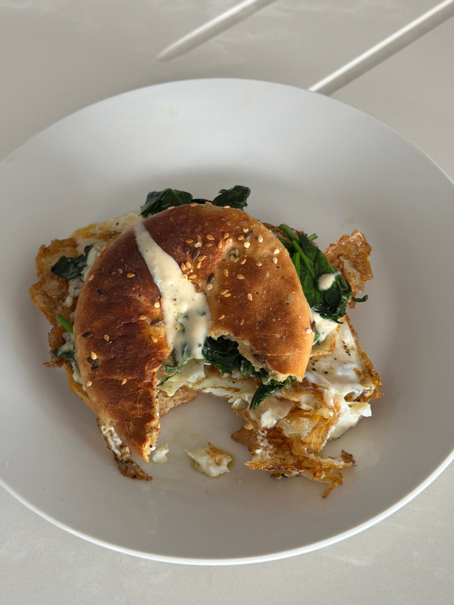 The image shows a half-eaten bagel sandwich on a white plate. The bagel appears to be multi-grain, with sesame seeds. The filling consists of cooked spinach, a fried egg, and a creamy white sauce. The…read more