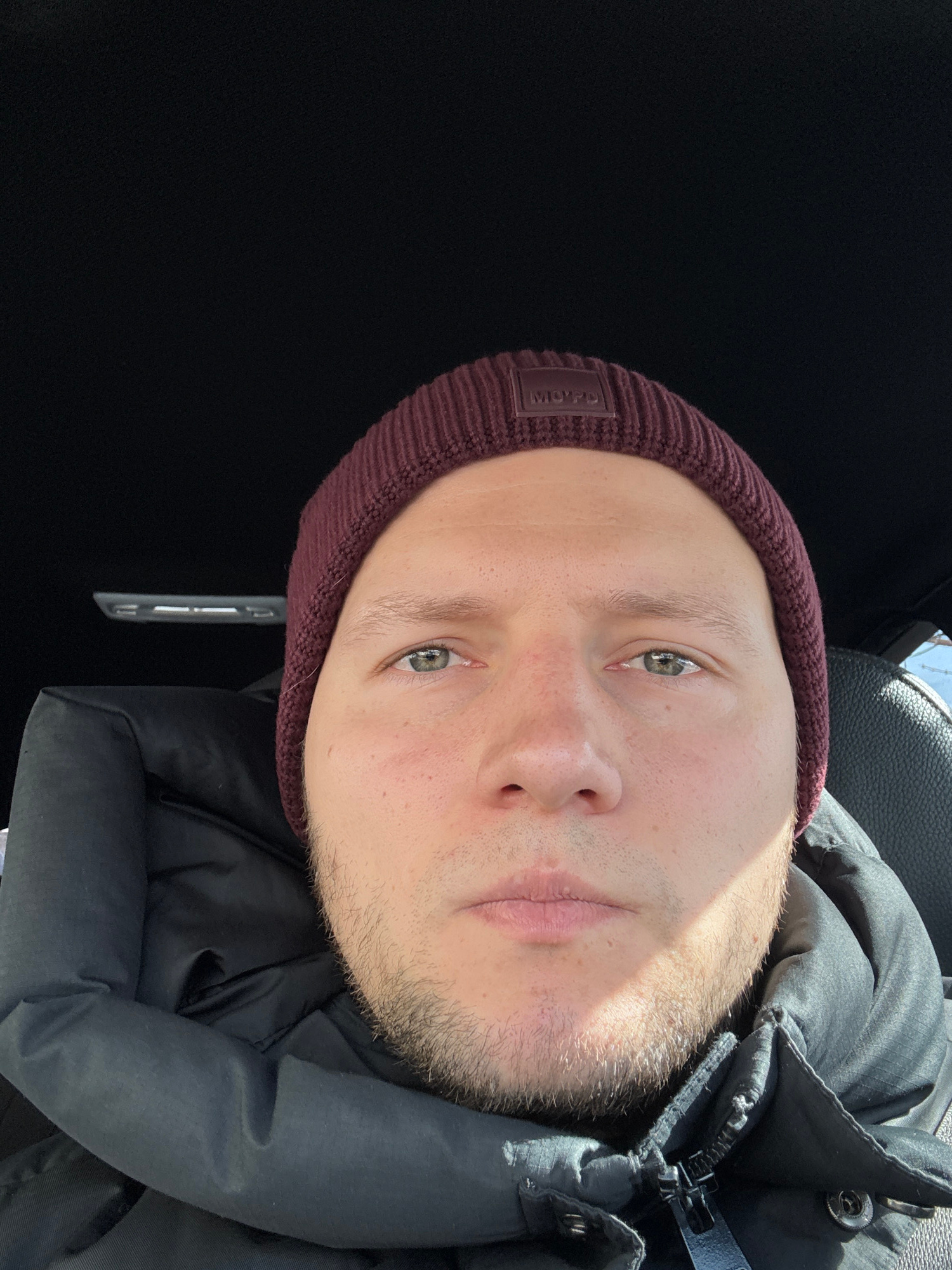 A close-up, slightly angled selfie depicts a fair-skinned male with short blonde hair, a light beard, and green eyes. He is wearing a maroon beanie with a logo patch on the left side. He is also weariβ¦read more