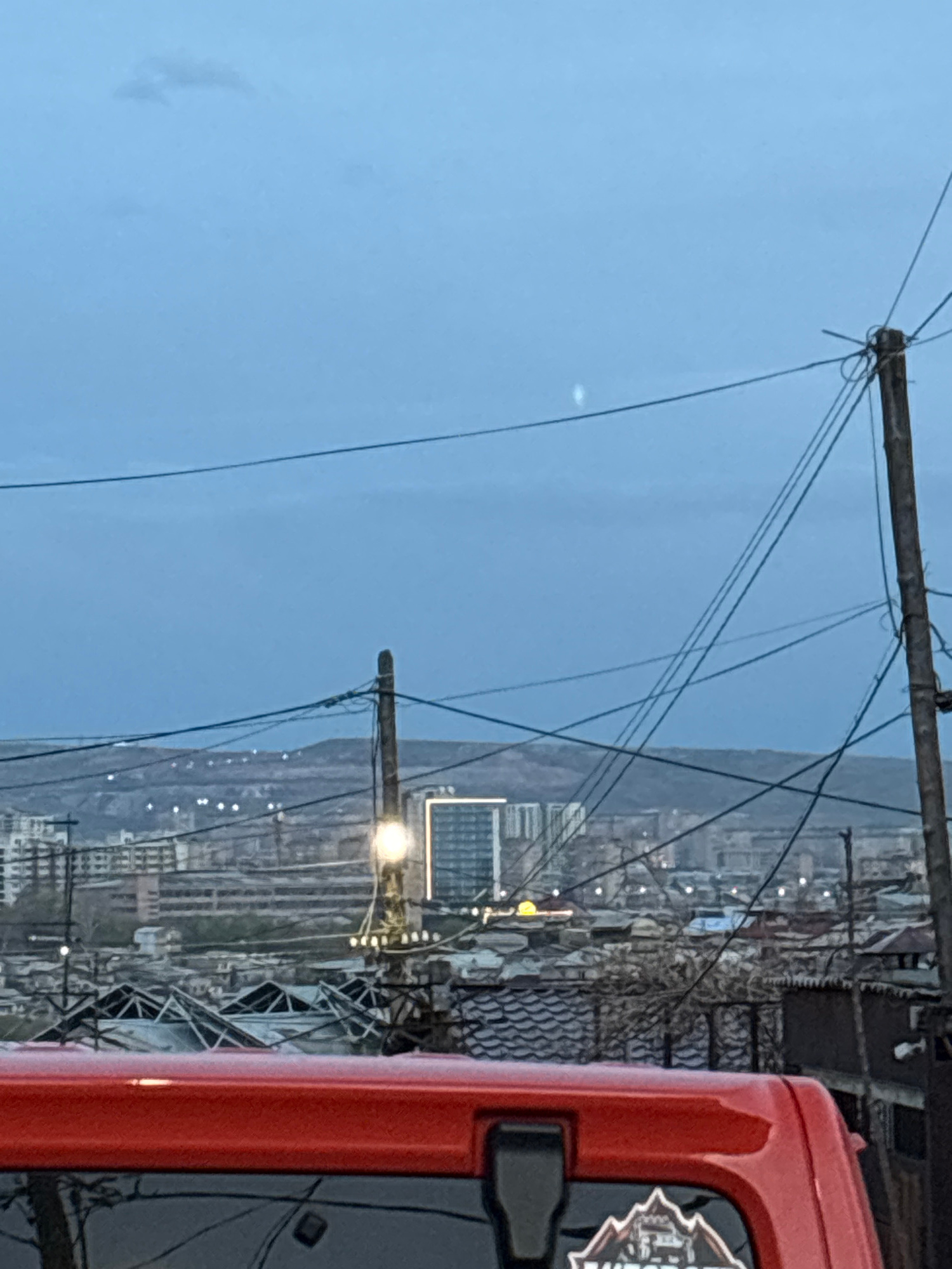 The image captures a cityscape of Yerevan, Armenia, framed by overhead power lines and a portion of a red vehicle on the right. The sky is overcast, casting a muted light over the scene. The city exte…read more