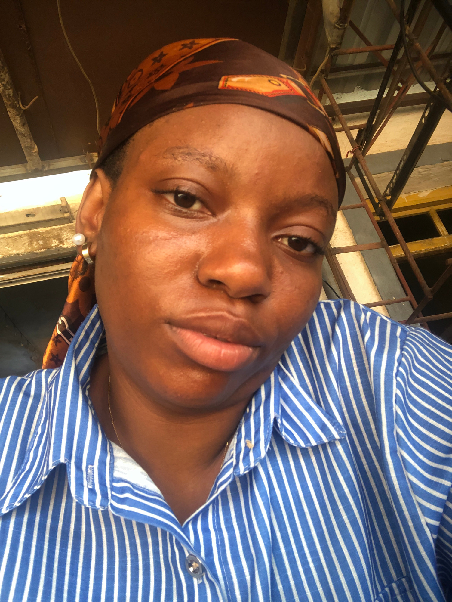 A close-up portrait captures a person, likely a woman, with dark skin, looking directly at the camera. She wears a blue and white striped collared shirt, and a brown headscarf with an indistinct patte…read more