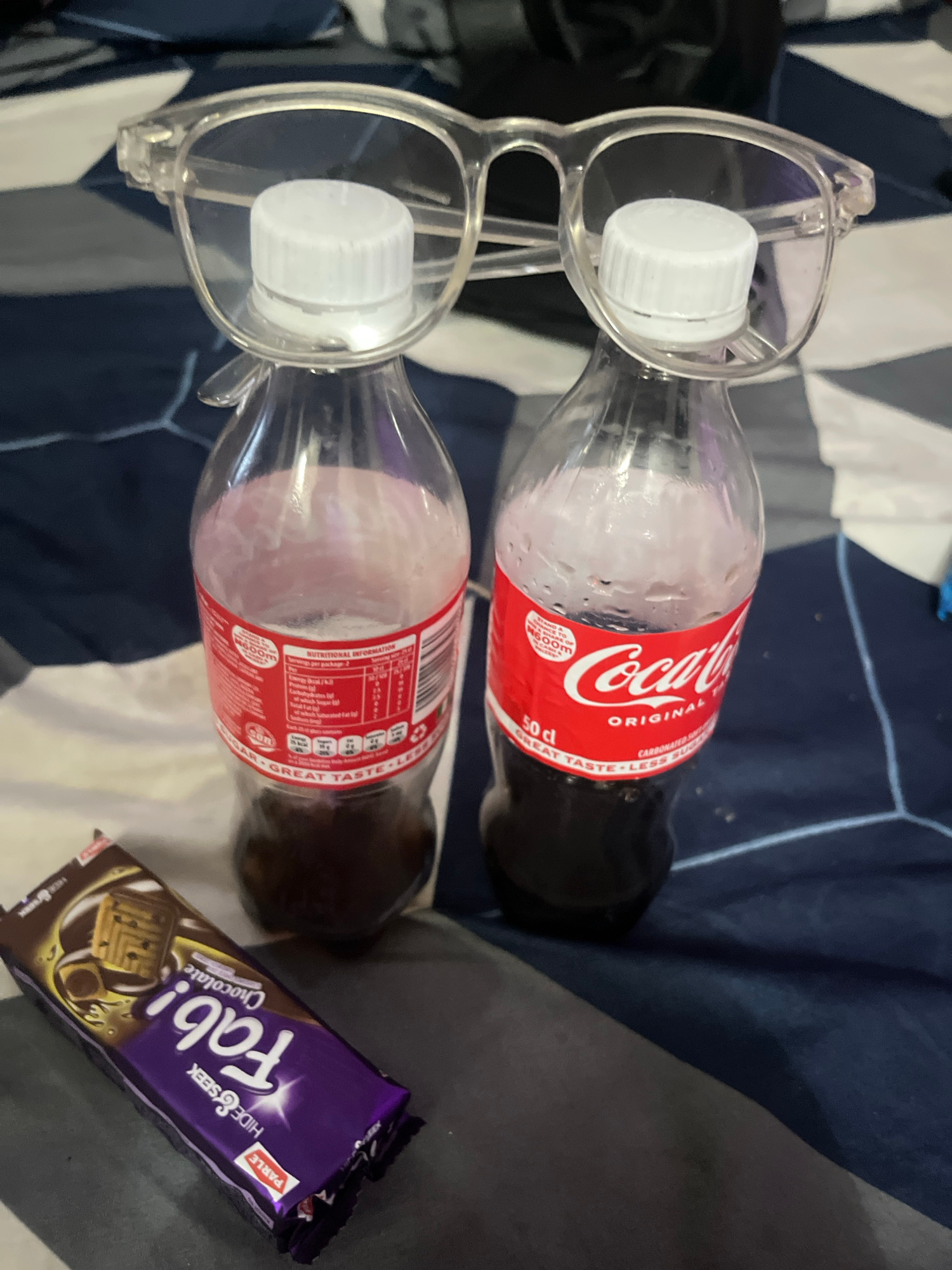 The image shows a scene with several items laid out on a surface with a dark blue and white geometric pattern. Two clear plastic glasses frames are positioned over the necks of two clear Coca-Cola bot…read more