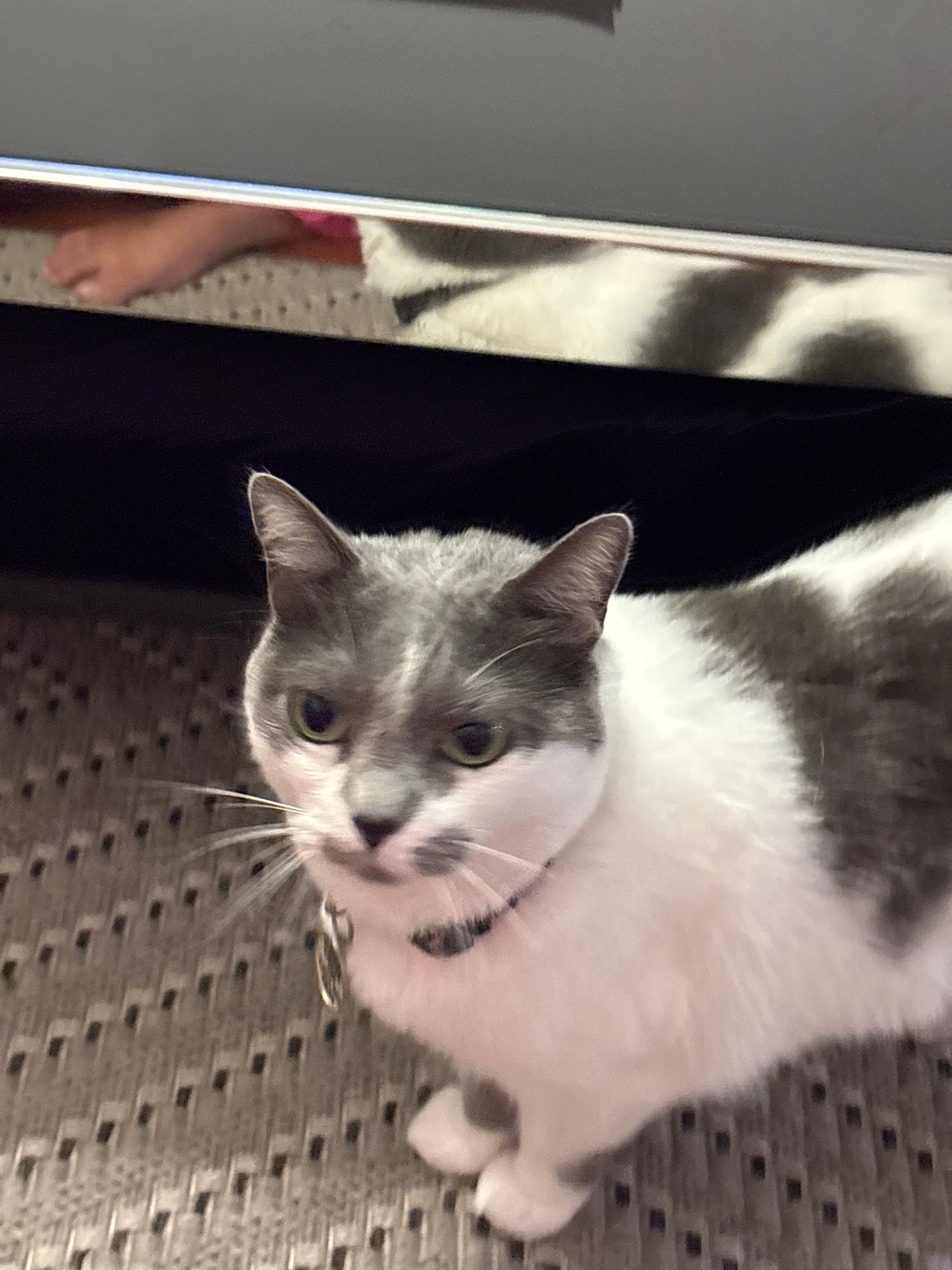 A white and gray cat is lying on a gray textured surface. The cat is wearing a collar with a tag. Part of a gray and white striped blanket, a black garment, a gray wall, and a partially visible person…read more
