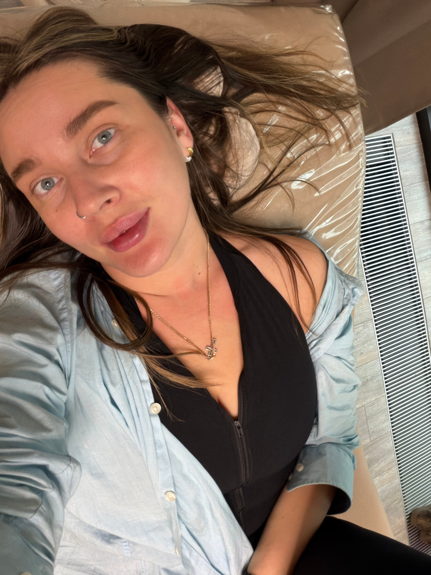 A woman is lying down wearing a black top and light blue button-down shirt. She has brown hair with blonde highlights, blue eyes, and multiple piercings in her ear and nose. She is wearing a gold neck…read more