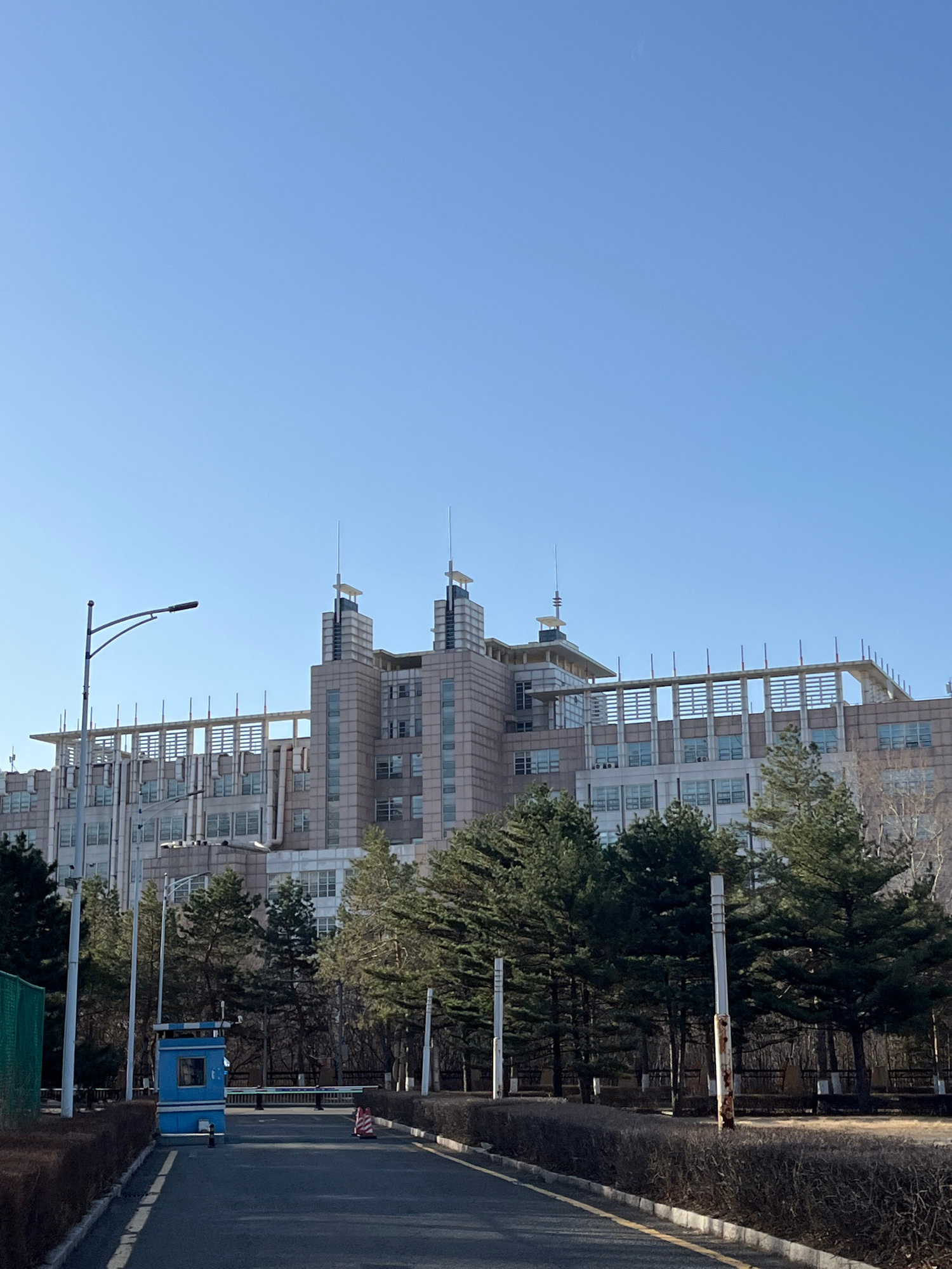 The image depicts an urban landscape in Changchun City, China, showcasing a tall, modern building complex with multiple towers and horizontal architectural features, possibly balconies. The buildings…read more