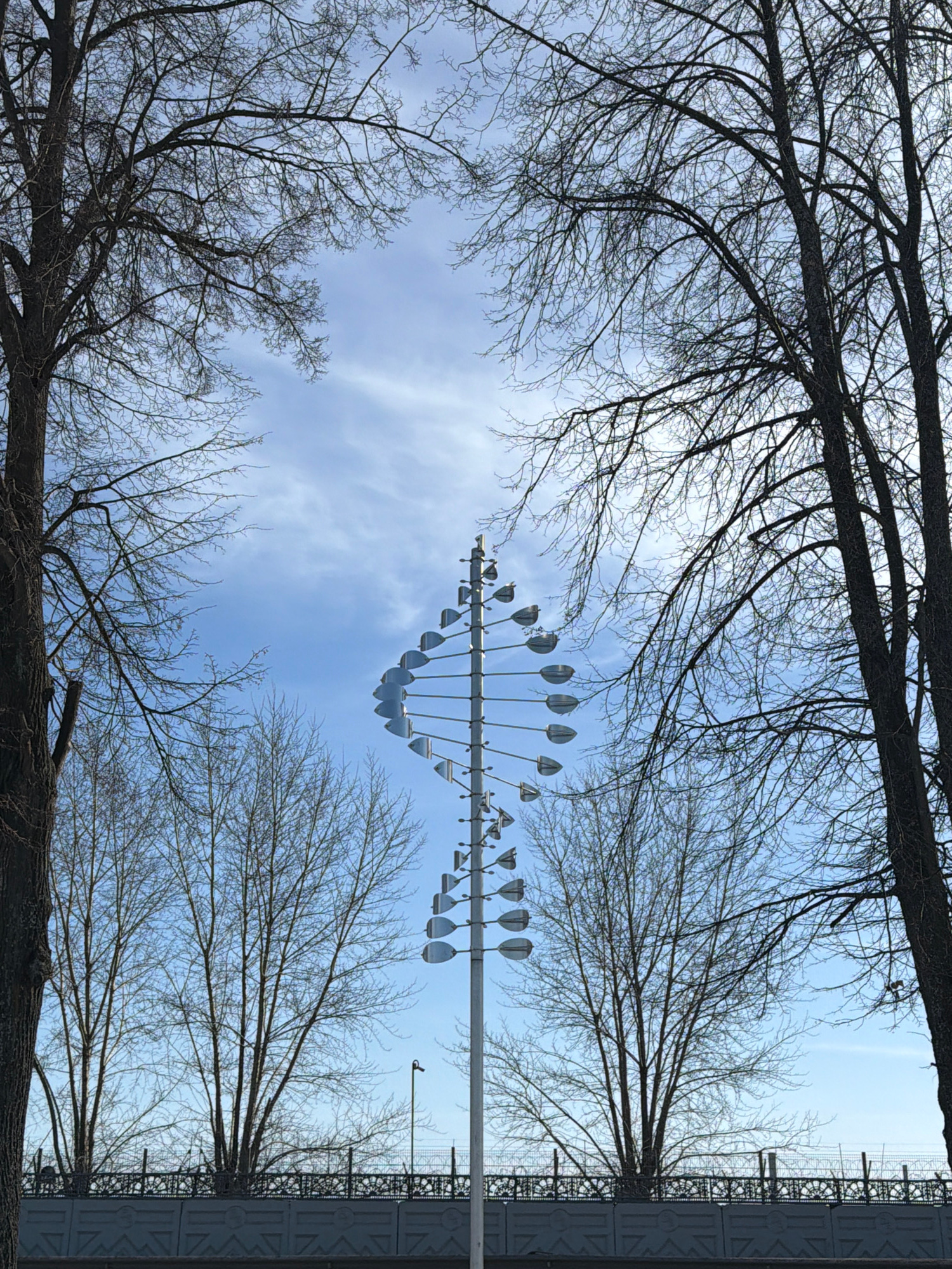 Captured from below in Votkinsk, Russia, a sky view is framed by bare tree branches in winter. An artistic wind chime structure resembling a DNA helix is suspended in the center, featuring reflective…read more