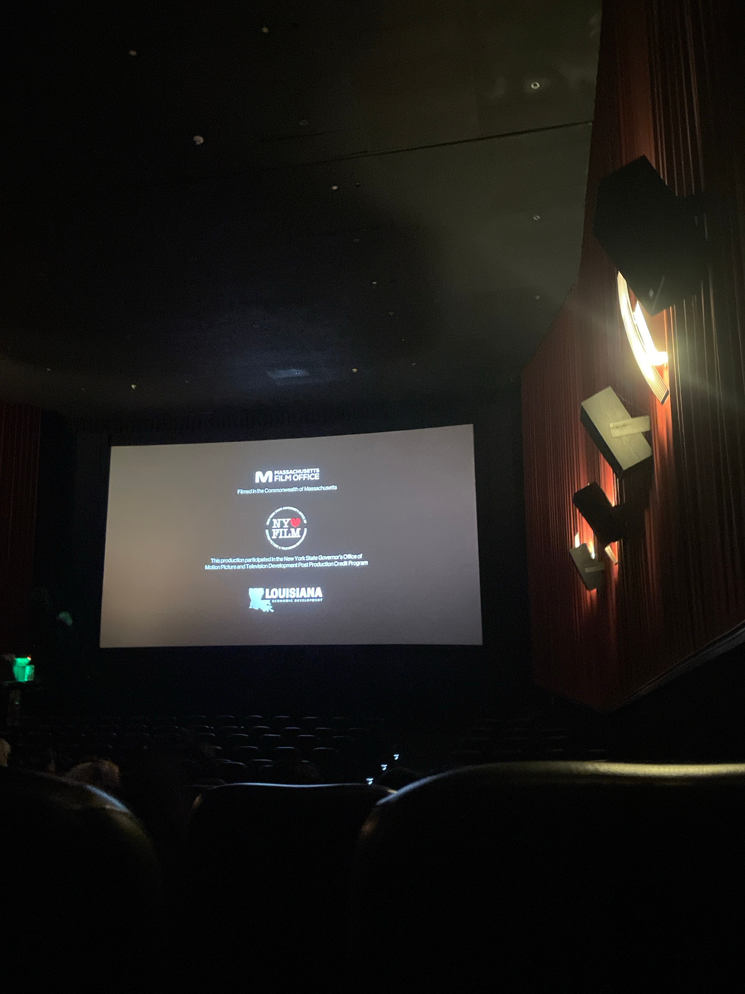The image depicts a movie theater screen displaying logos of film offices from Massachusetts, New York, and Louisiana, indicating their involvement in the movie's production. The theater's ceiling has…read more