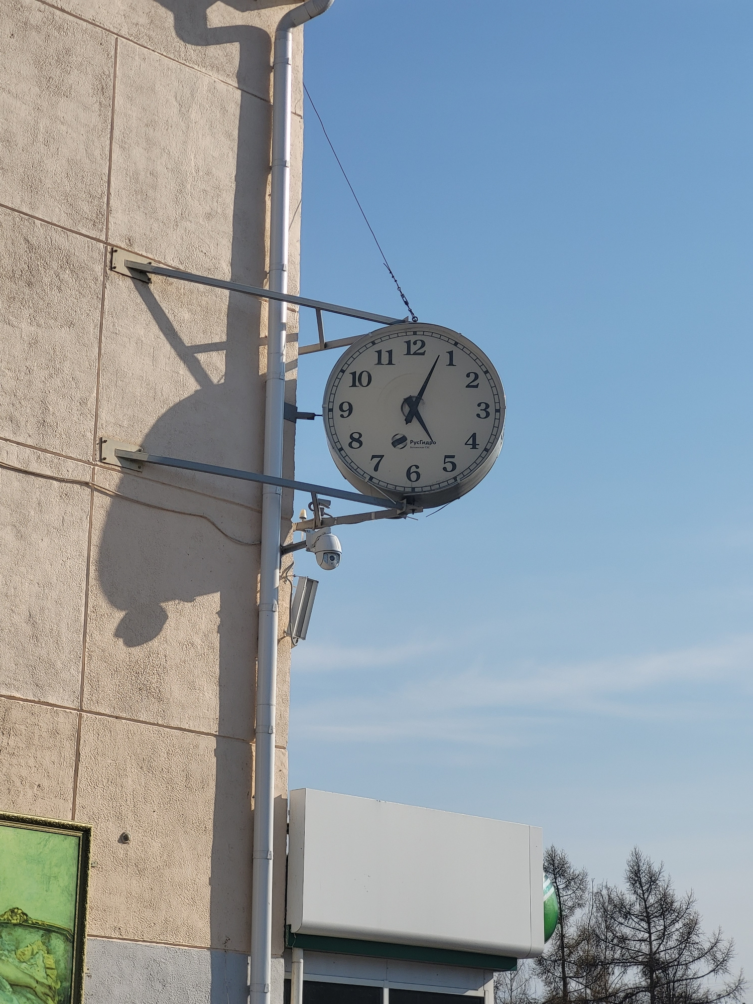 The image shows a clock on a building in Chaikovsky, Russia. The clock has a white face with black numbers and hands, and it is mounted on a metal stand. A security camera is mounted near the clock. T…read more