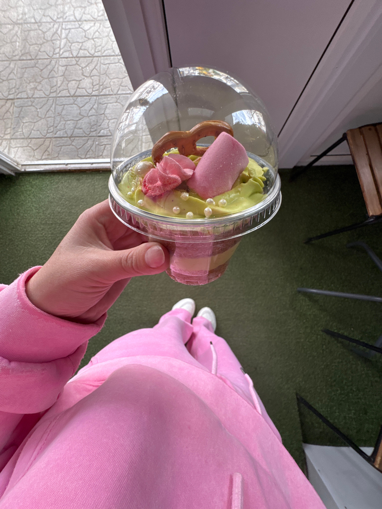 A person is captured in a high-angle shot, holding a colorful dessert in a transparent plastic cup in their right hand. The person is dressed in pink, visible through a long-sleeved top and sweatpants…read more