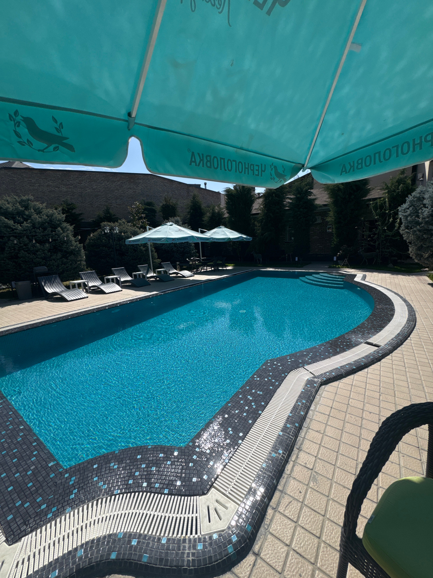 The image presents an outdoor swimming pool at what appears to be a resort or hotel. The pool is partially surrounded by a paved area, with lounge chairs lined up beside it. A large, light-blue paraso…read more