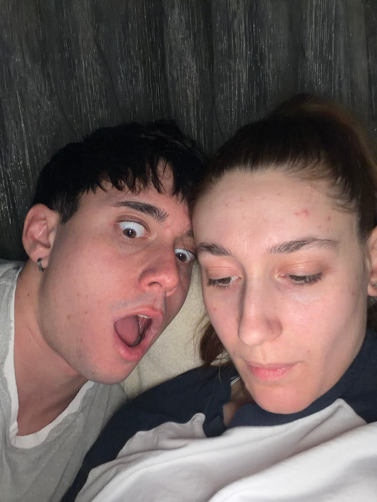 Two individuals are positioned in close proximity, likely indoors. The person on the bottom has dark hair, pale skin, and an open mouth. The other person has light brown hair, closed eyes, and pale sk…read more