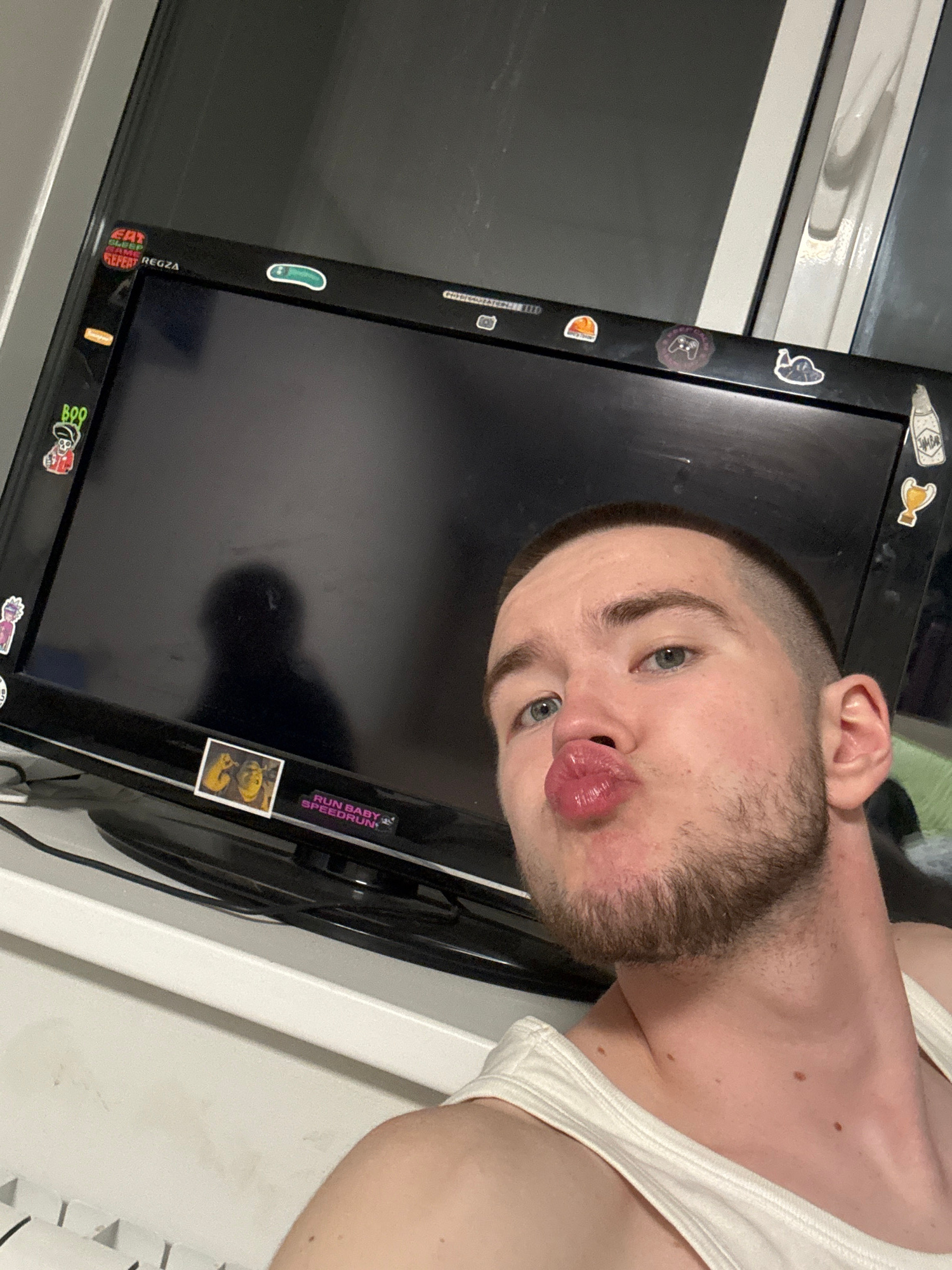 The image is a tilted selfie of a young man, presumably taken indoors in Kazan, Russia. The man has light skin, blue eyes, and a short beard, and is wearing a white tank top. His head is angled, and h…read more