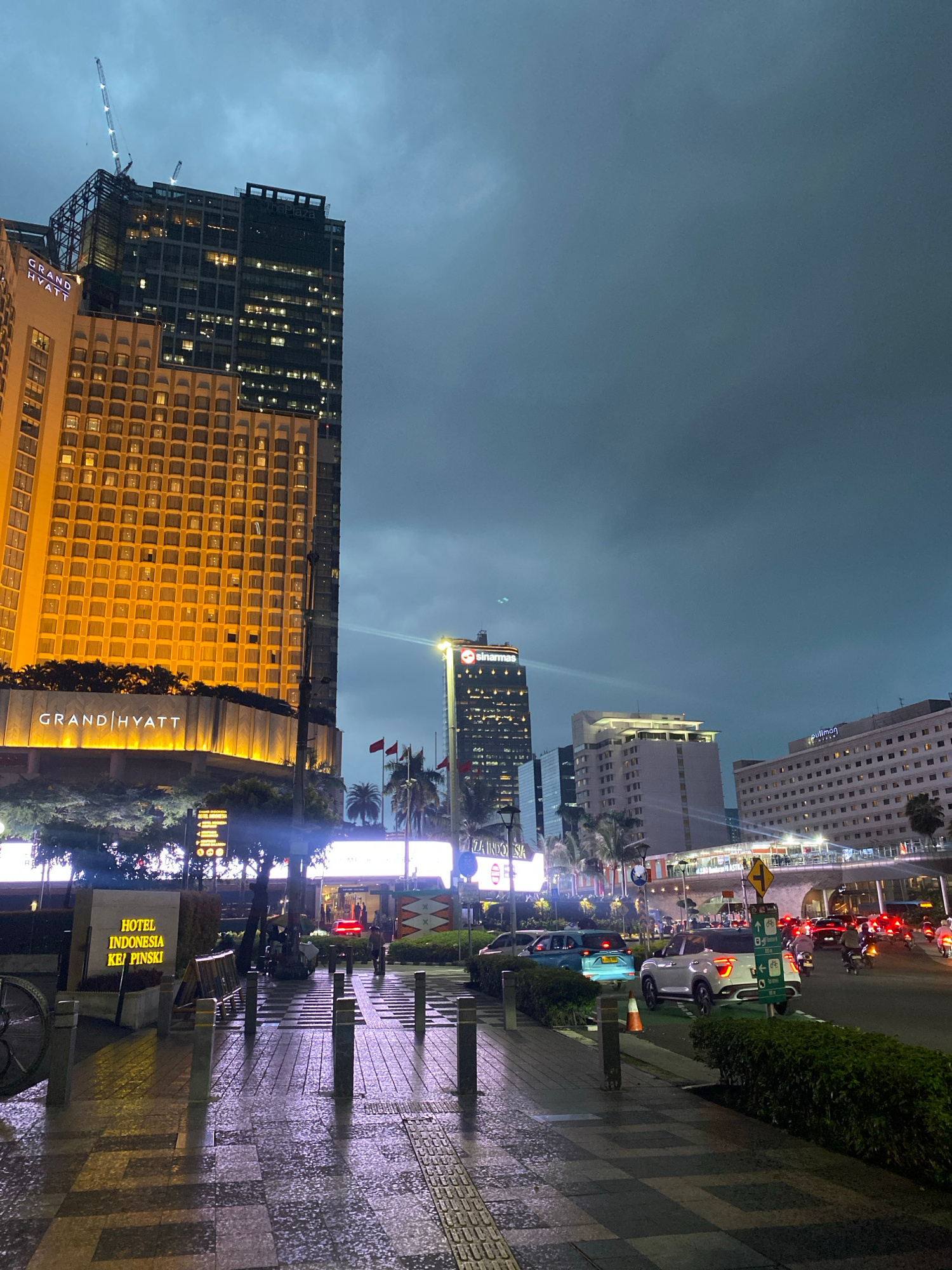 The image depicts a street scene in Central Jakarta, Indonesia at dusk or night. The view is predominantly of a sidewalk, reflecting light, suggesting it may have recently rained. On the left is the G…read more