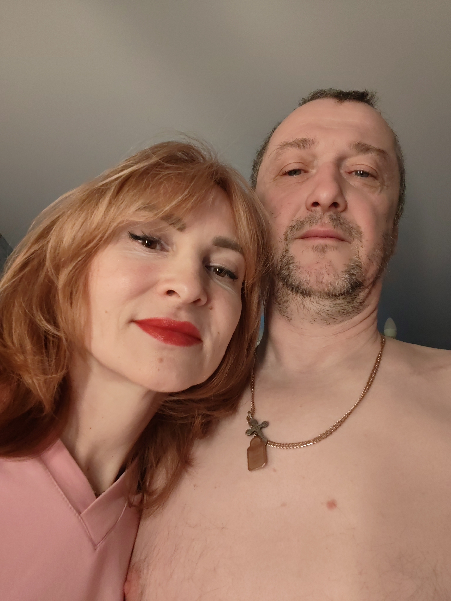 A photograph depicts a man and a woman posing closely together, taken at an indoor location, likely in an apartment setting based on the background. The woman is on the left, with shoulder-length red…read more