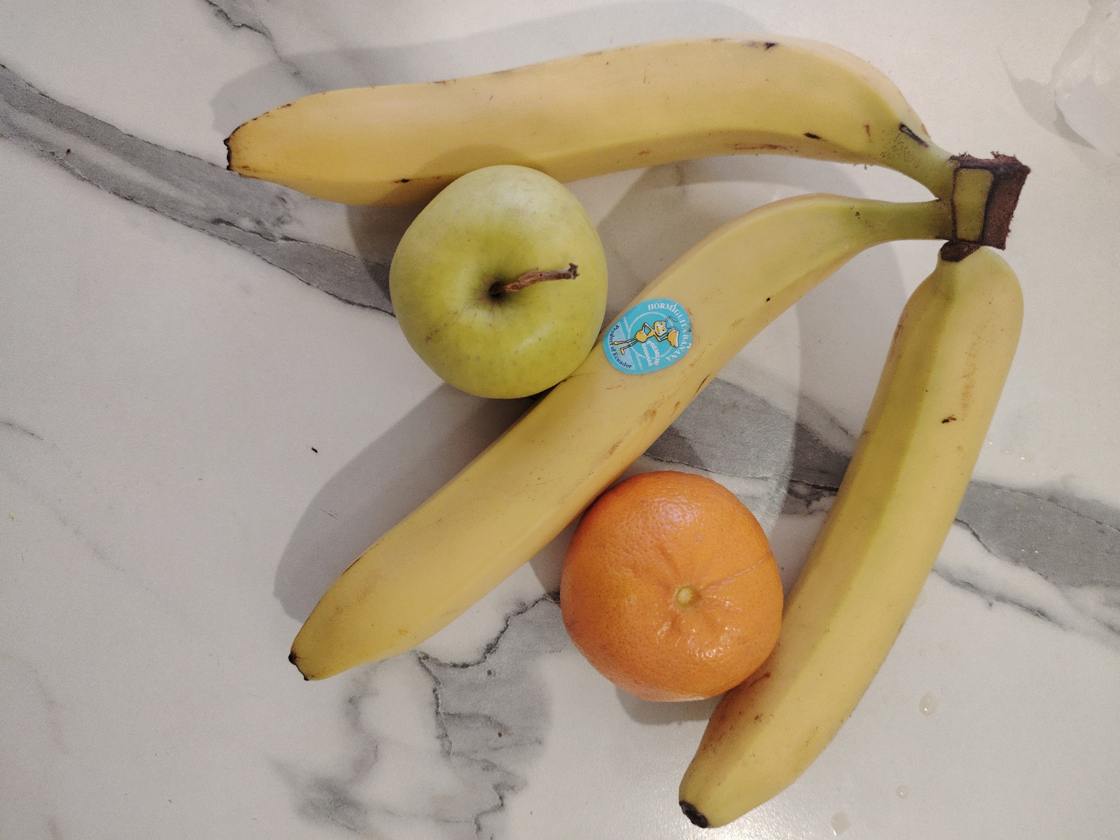 The image presents a still life arrangement of fruits on a white marble countertop. Three bananas are clustered together, their stems connected. An apple, light green with a visible stem, sits near th…read more