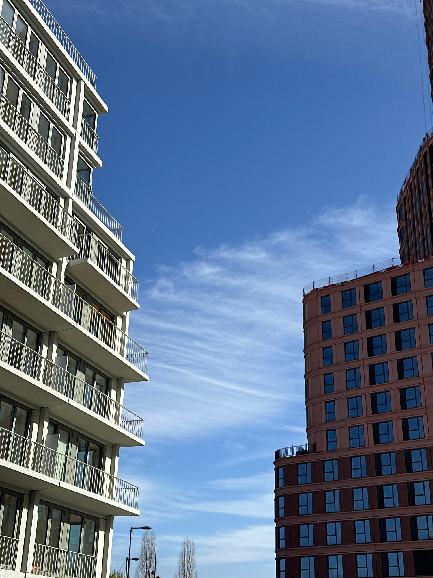 The image captures an upward-looking perspective between two contrasting tall buildings set against a vibrant blue sky with wispy clouds, likely in Amsterdam, Netherlands. On the left side of the fra…read more