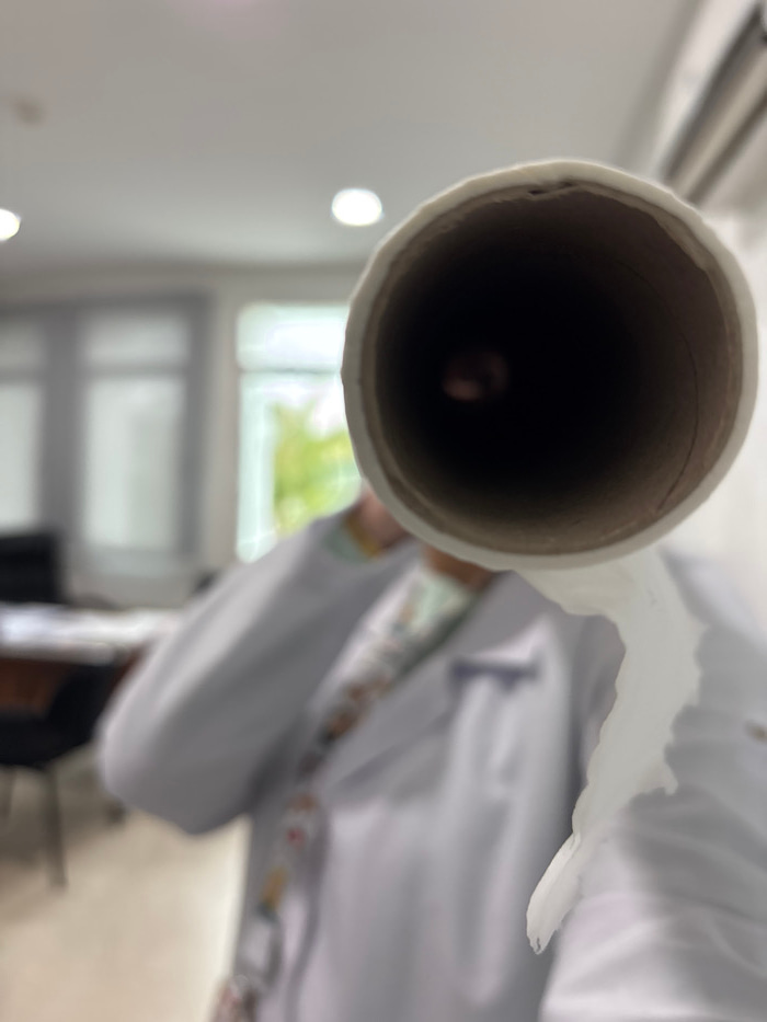 The scene depicts an indoor environment within Meknes, Morocco. In the immediate foreground, a cylindrical brown cardboard tube, resembling an empty toilet paper roll, is positioned directly towards t…read more