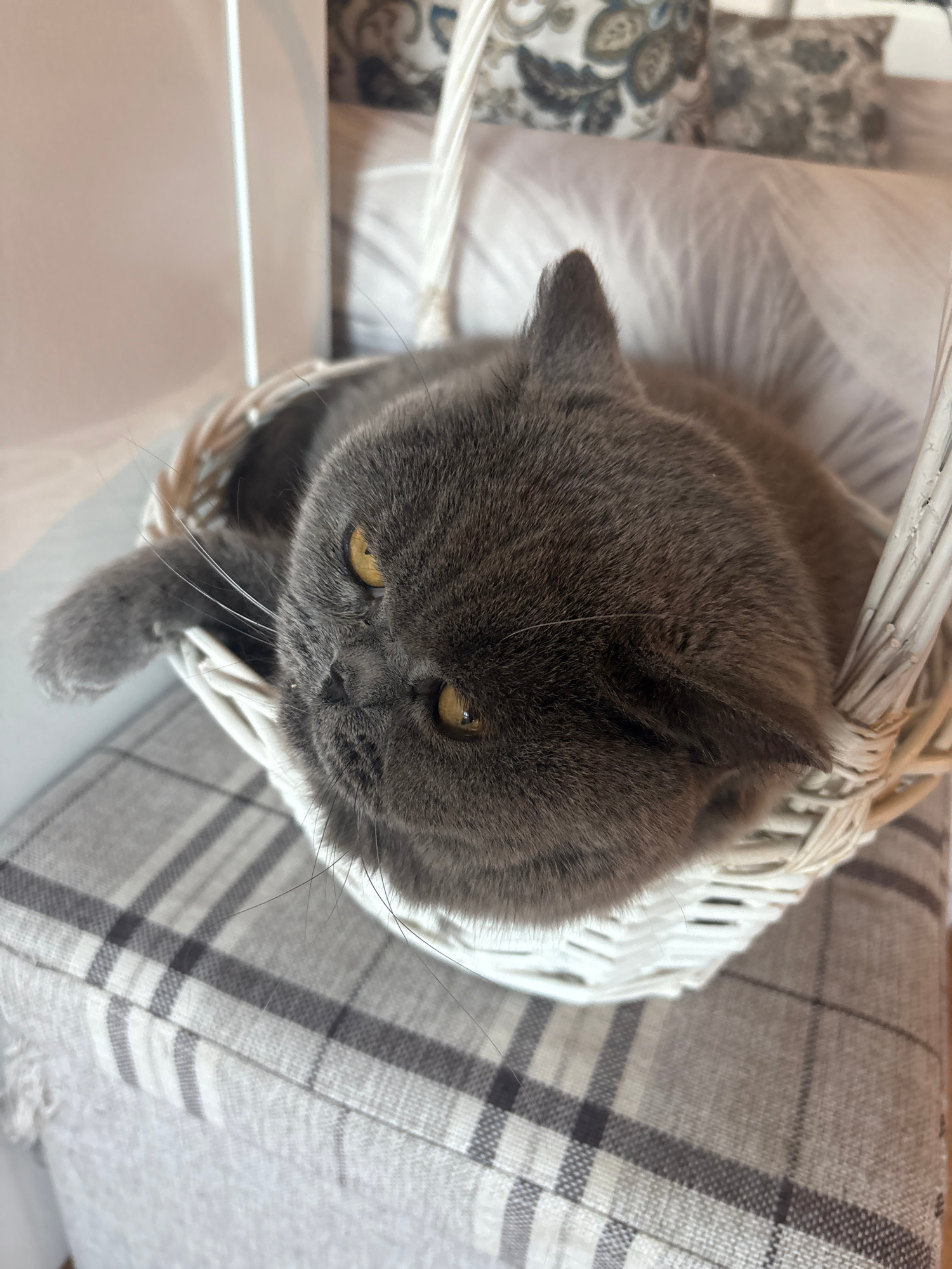 A gray cat with yellow eyes sits in a white wicker basket. The basket is placed on a plaid patterned cushion. The location is Burgas, Bulgaria.