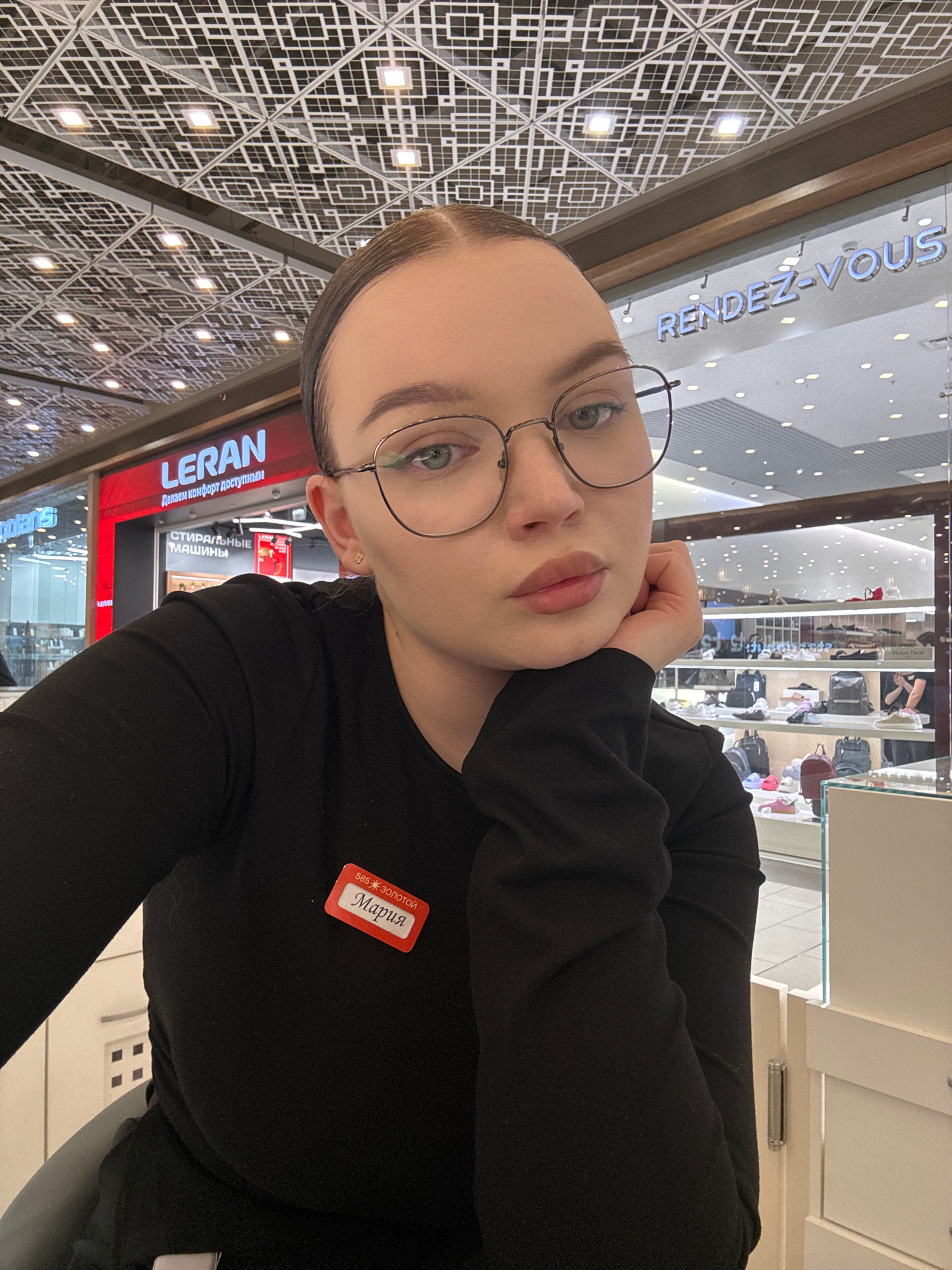 A woman wearing glasses and a black shirt is posing for a selfie in a shopping mall. The woman's name tag reads "Maria 585 Zolotoi". The mall features stores such as "LERAN" and "RENDEZ-VOUS". The sce…read more
