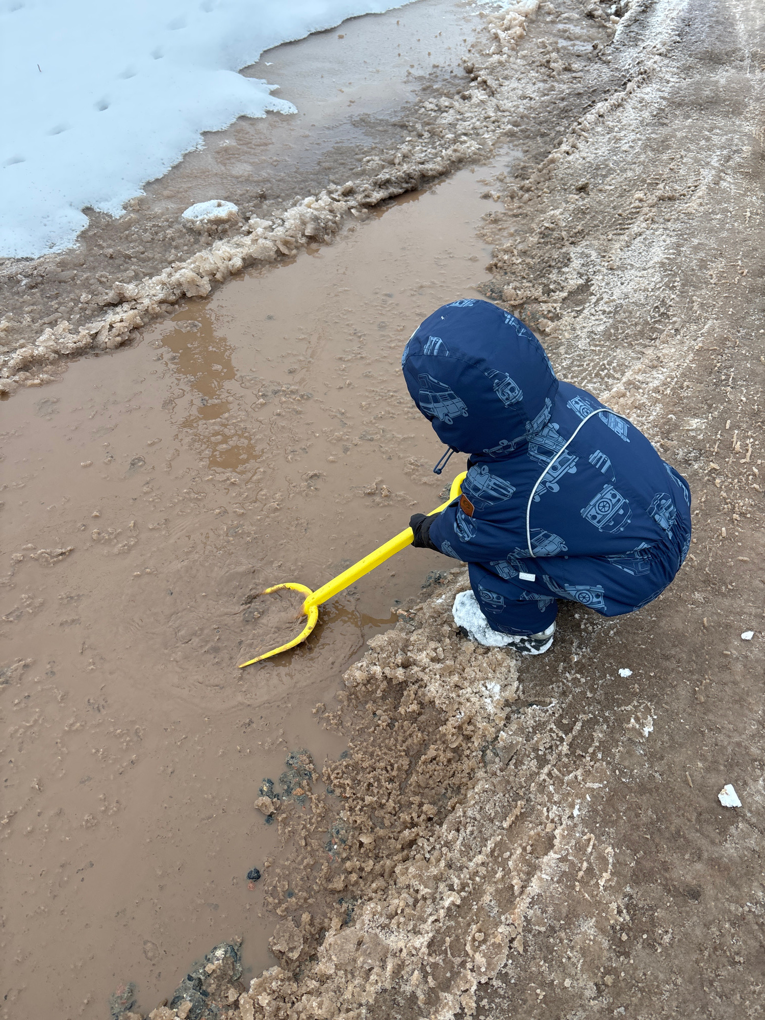 A child in a navy blue snowsuit with a grey fire engine pattern is playing in a large puddle of muddy water with a yellow toy rake. The surrounding area is a mix of melting snow, ice, and dirt. Patche…read more