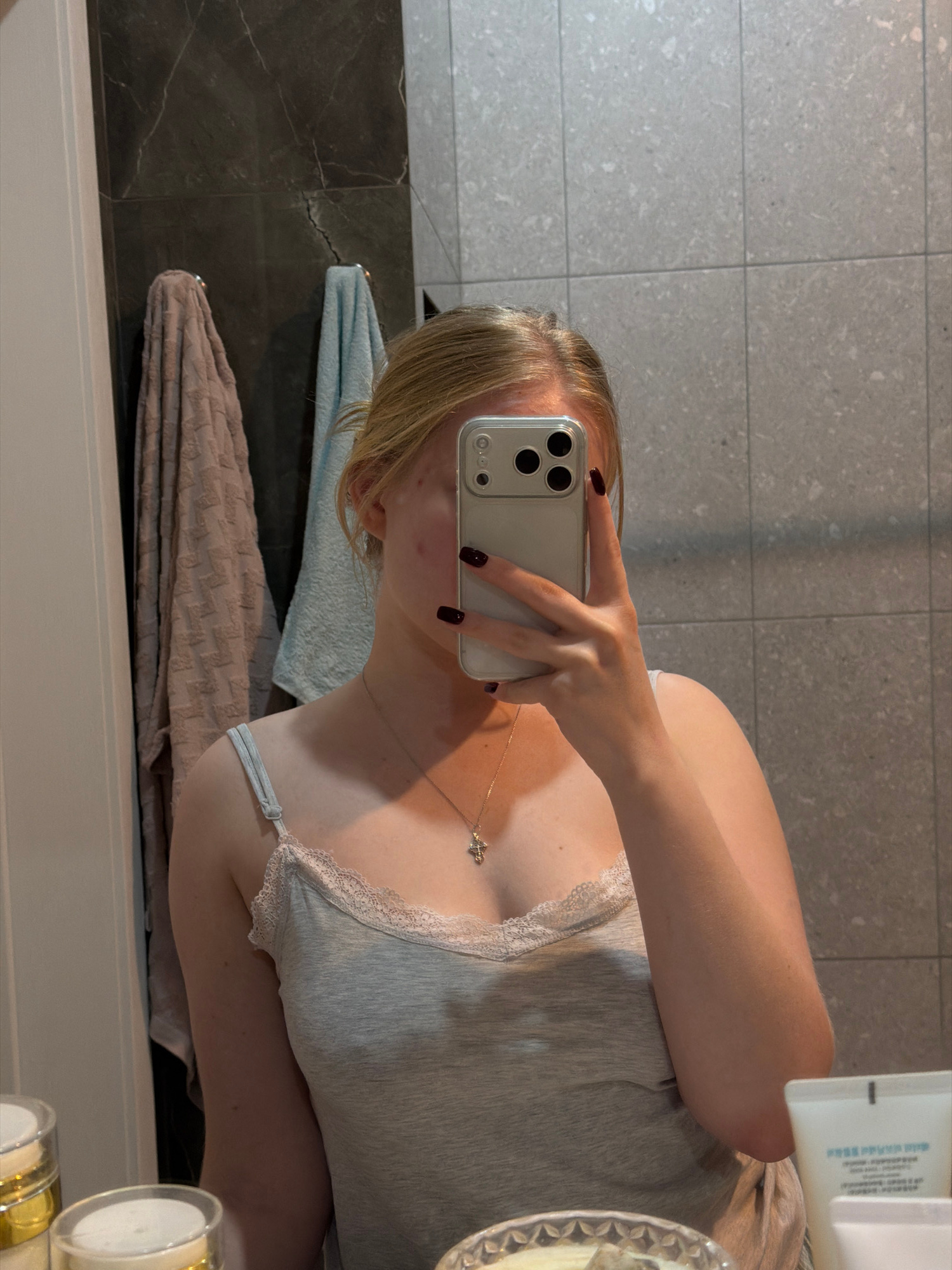 A person with blonde hair is taking a mirror selfie with a silver iPhone. They are wearing a gray tank top with lace trim. A silver necklace with a small charm is visible around their neck. The backgr…read more