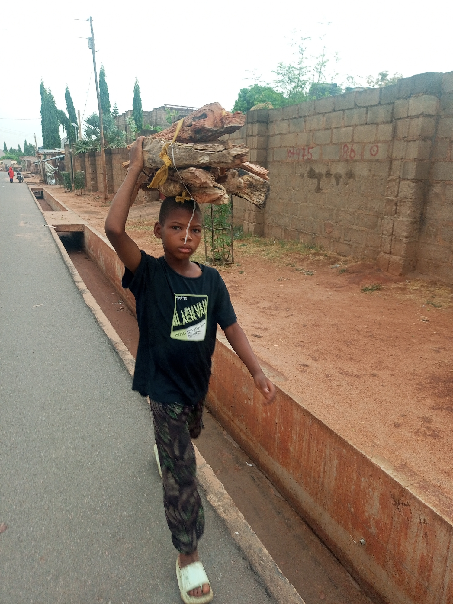 A young boy carries a bundle of firewood on his head while walking on a street in Tempure, Nigeria. He wears a black t-shirt, camouflage pants, and sandals. The street is paved, with a drainage ditch…read more