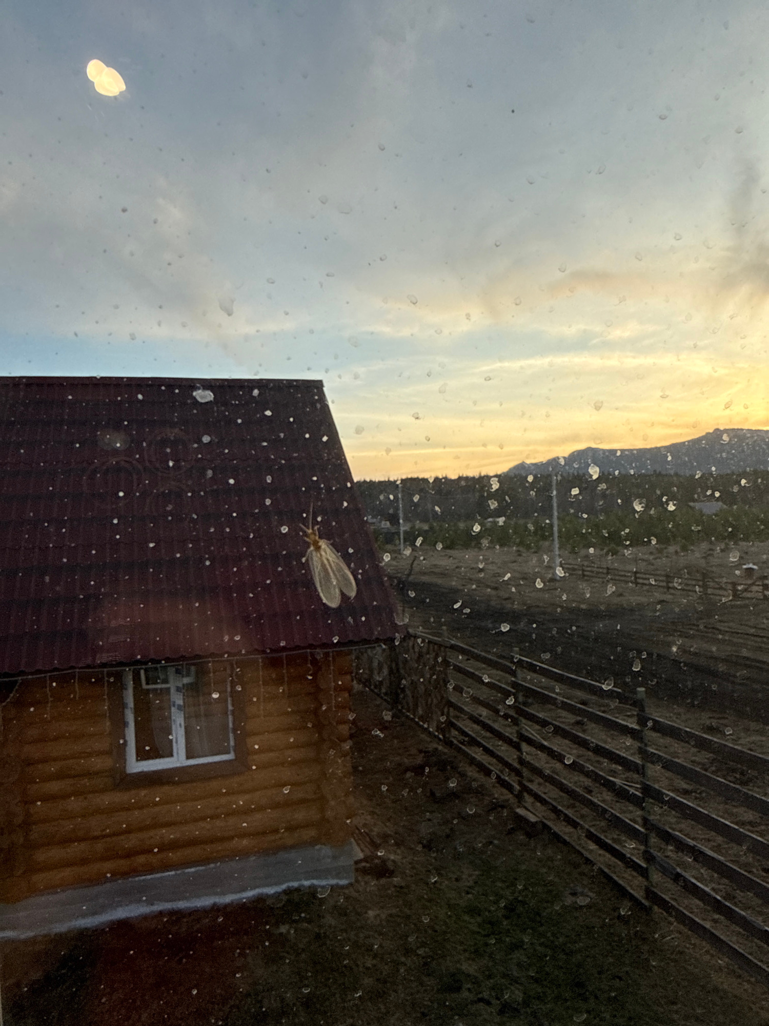 The image appears to be taken from inside, looking out through a window. Raindrops or water spots obscure the view on the window's surface. Outside, there's a view of a wooden structure, likely a hous…read more