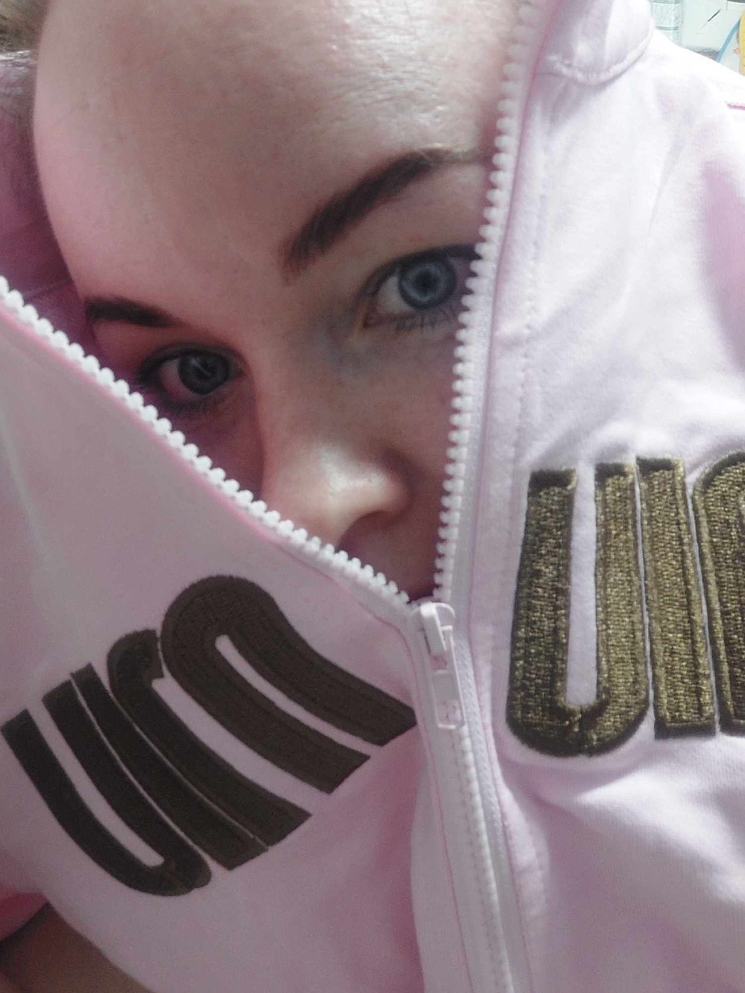 A close-up, slightly angled image focuses on a person's face, partially obscured by a pink hooded jacket. The jacket's hood is partially zipped, framing the person's face. The jacket is embroidered wi…read more