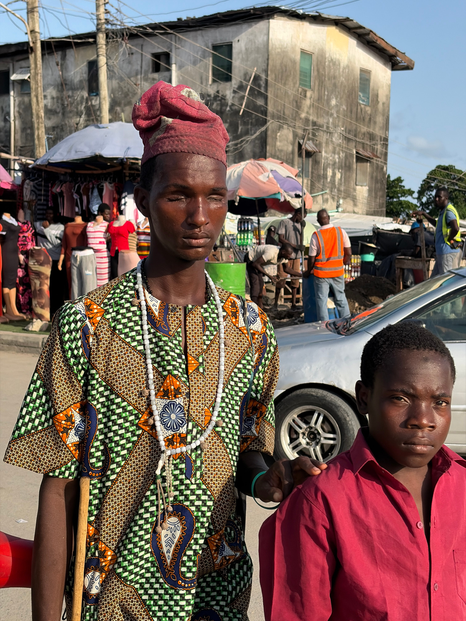 The image is of two dark-skinned individuals in Igboefon, Nigeria. The foreground subject, wearing a red head wrap and patterned green, brown, and orange shirt with a white beaded necklace, holds a wo…read more
