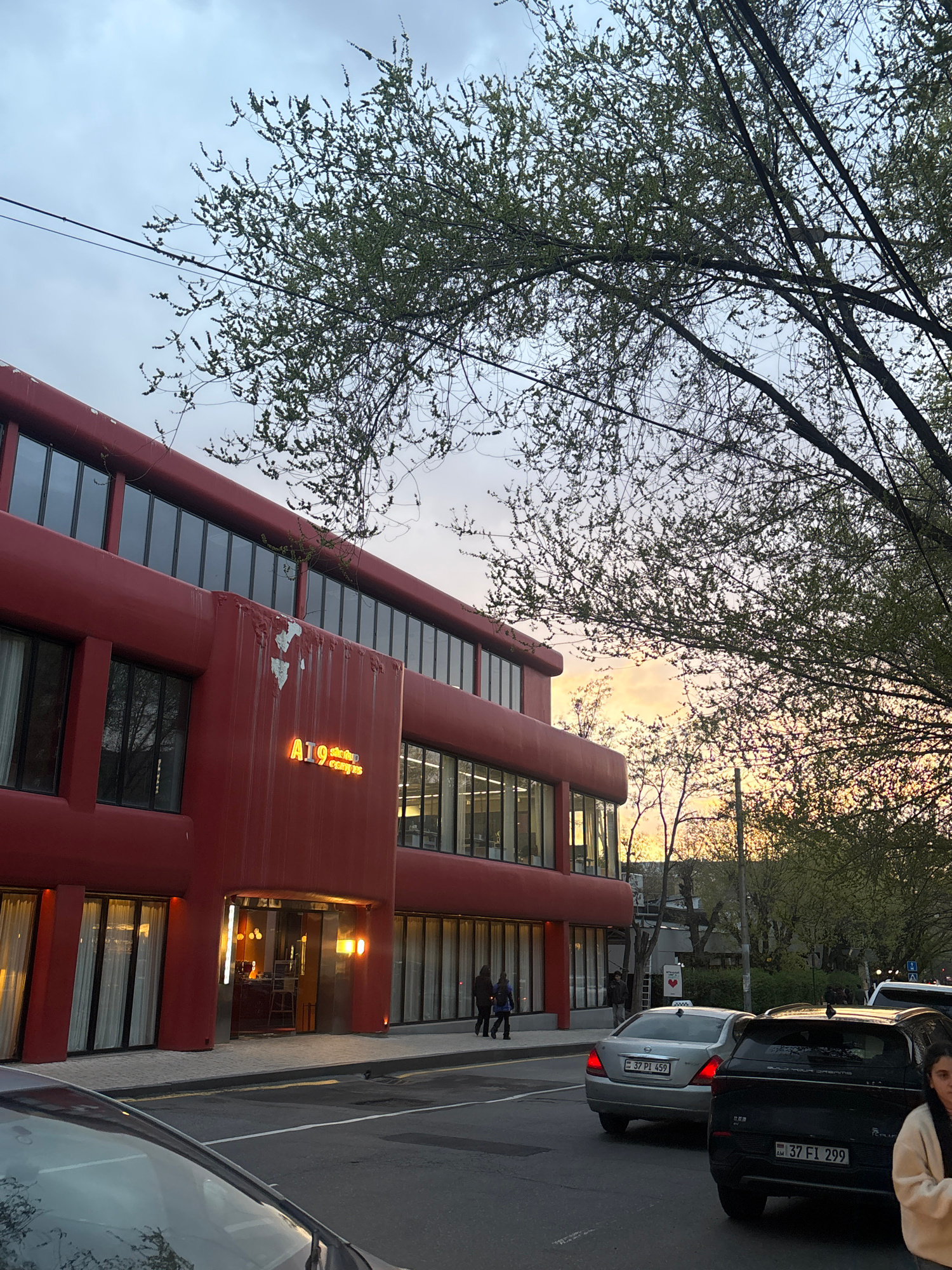The image shows a multi-story, red building with glass windows. A sign on the building reads "A19 Student Campus". The sky is visible above the building, with a mix of clouds and a hint of sunset colo…read more