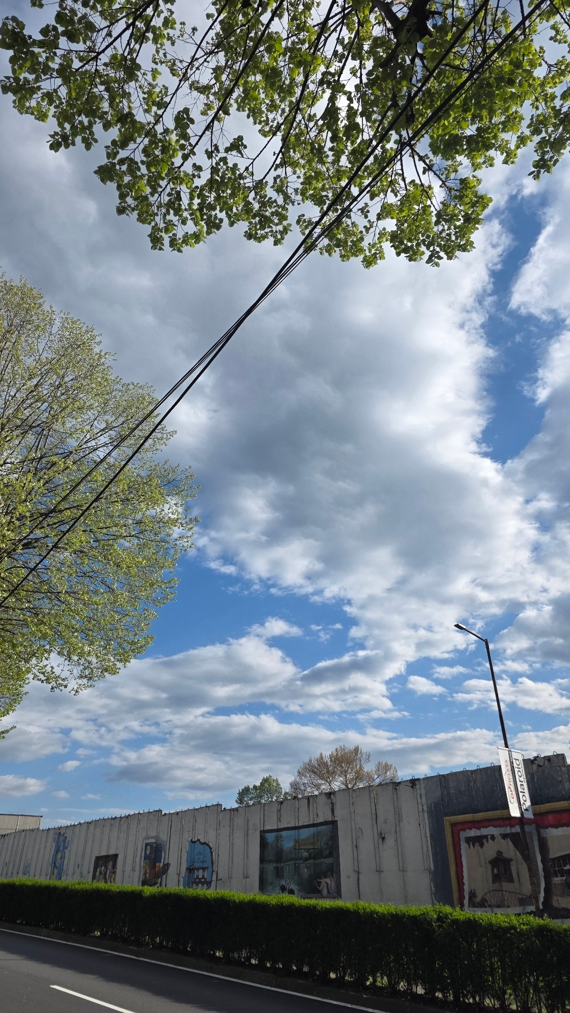 The image depicts a view of the sky with trees, power lines, a building with murals, and street signs in Blagoevgrad, Bulgaria. The sky is partly cloudy with blue patches. Green trees with leaves are…read more