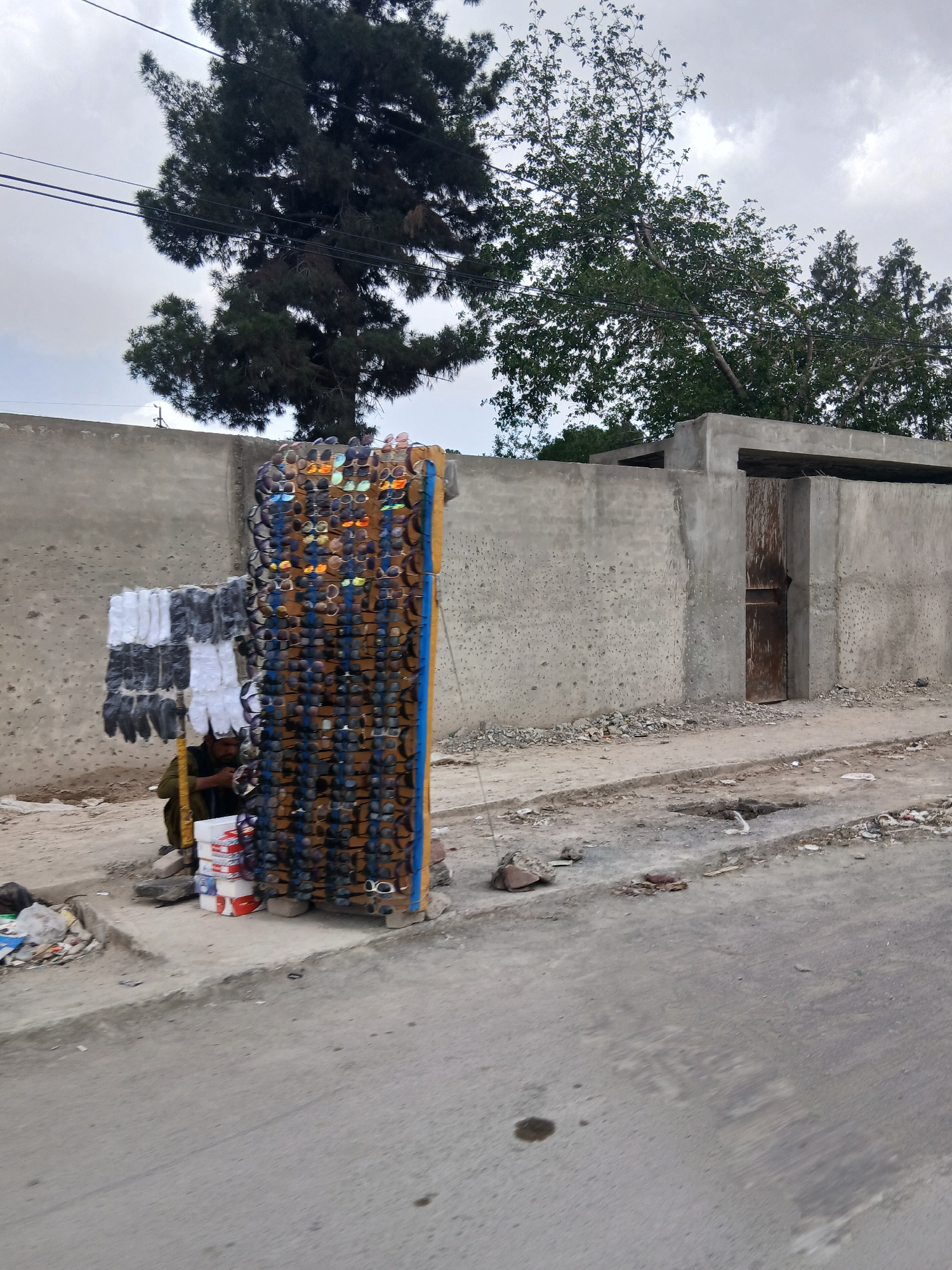 The image shows a street scene in Quetta City Tehsil, Pakistan. A vendor displays a large collection of sunglasses on a wooden rack beside a concrete building. Below the sunglasses, a display of whit…read more