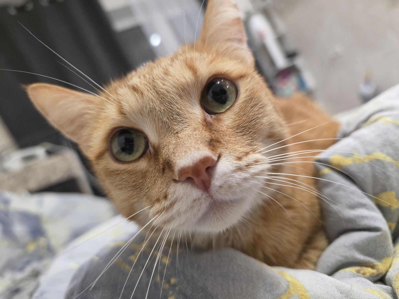 A close-up, eye-level shot shows an orange tabby cat lying on a patterned grey blanket. The cat has short fur, green eyes, and long white whiskers. The cat's gaze is directed towards the camera. In th…read more