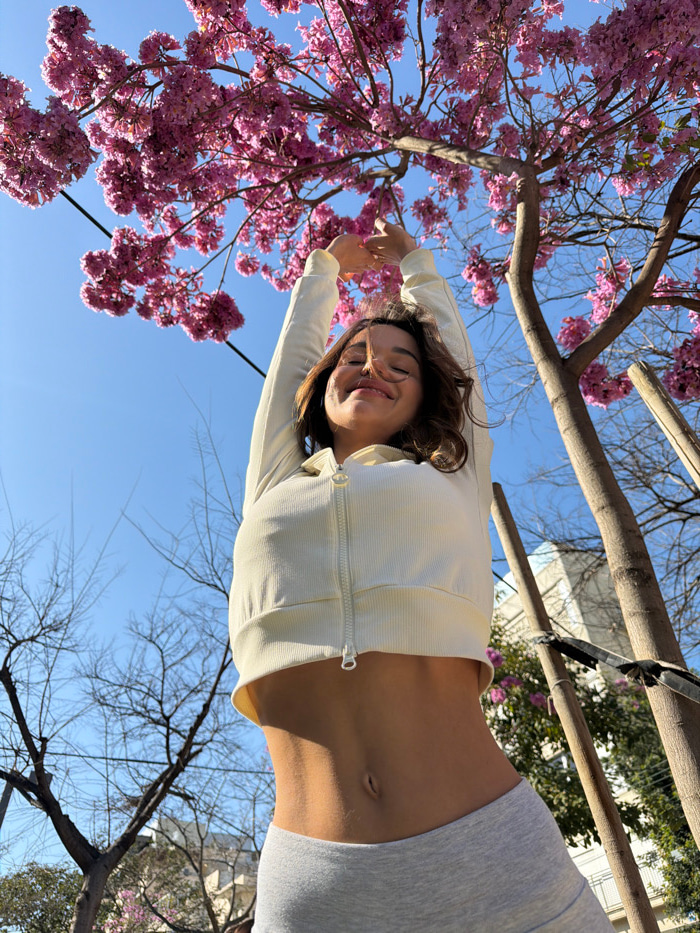 An adult female is depicted stretching outdoors in an urban setting in Tel-Aviv, Israel. The subject, viewed from a low angle, wears a light cream ribbed cropped long-sleeve jacket and light gray athl…read more