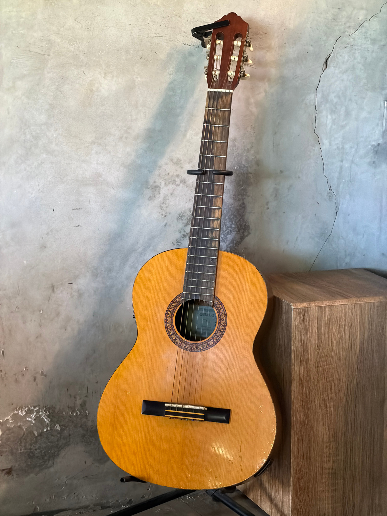 A horizontally oriented medium shot depicts a classical guitar lying on a weathered concrete floor, adjacent to a wooden cabinet. The guitar is light brown with a dark brown headstock and fretboard. A…read more